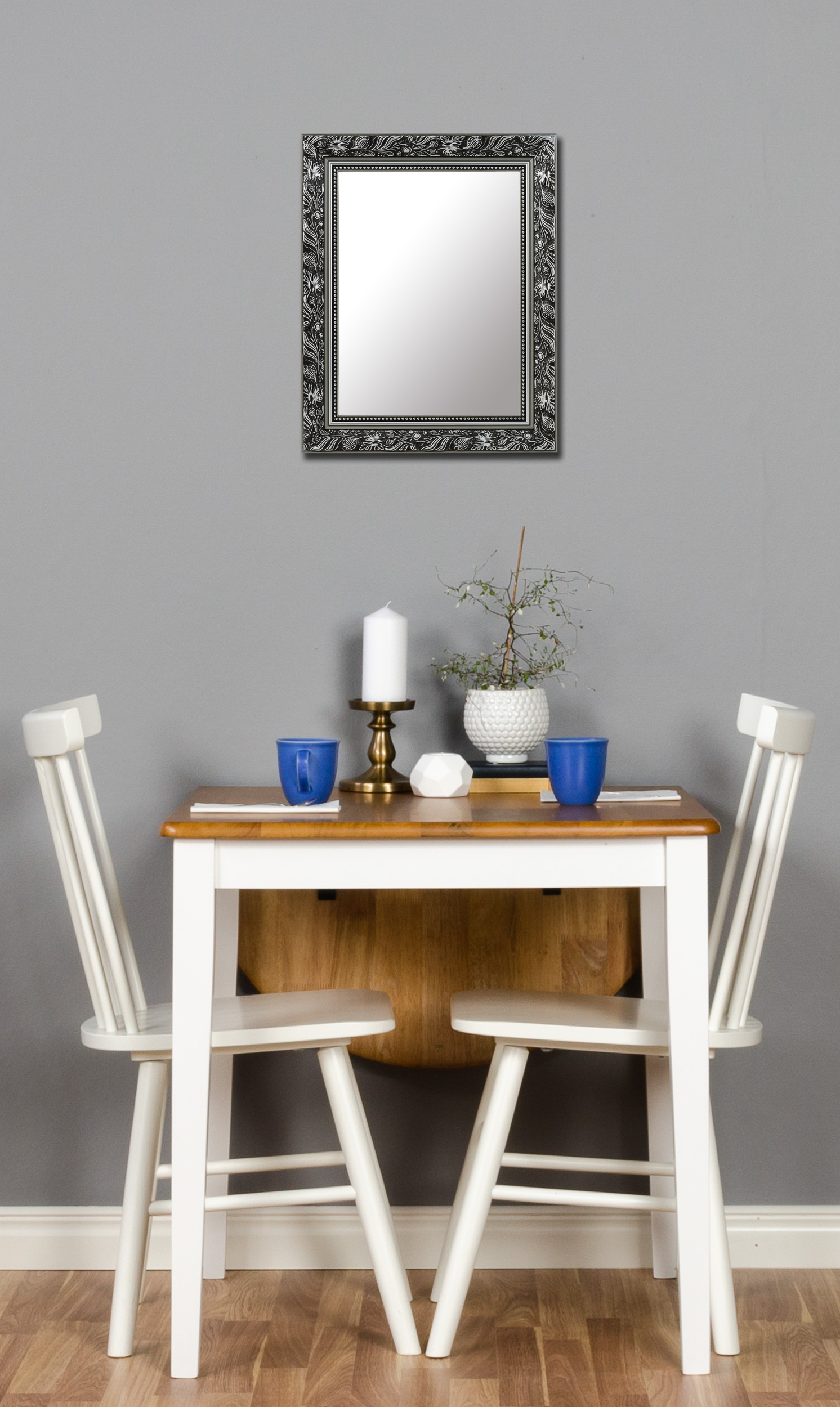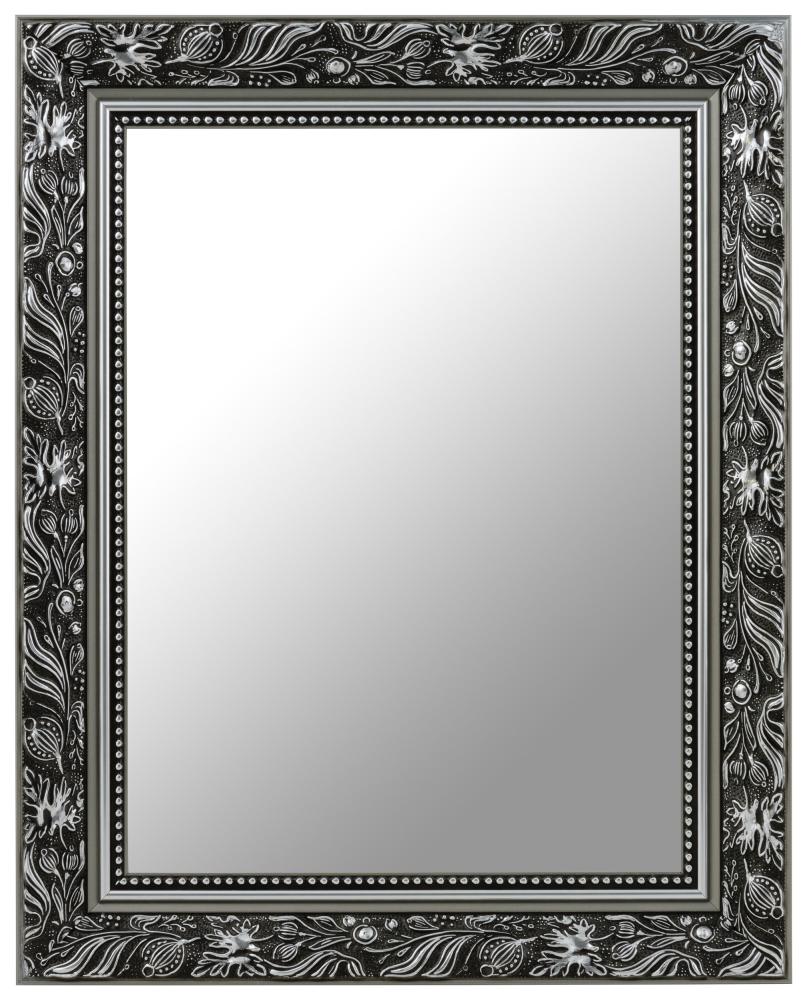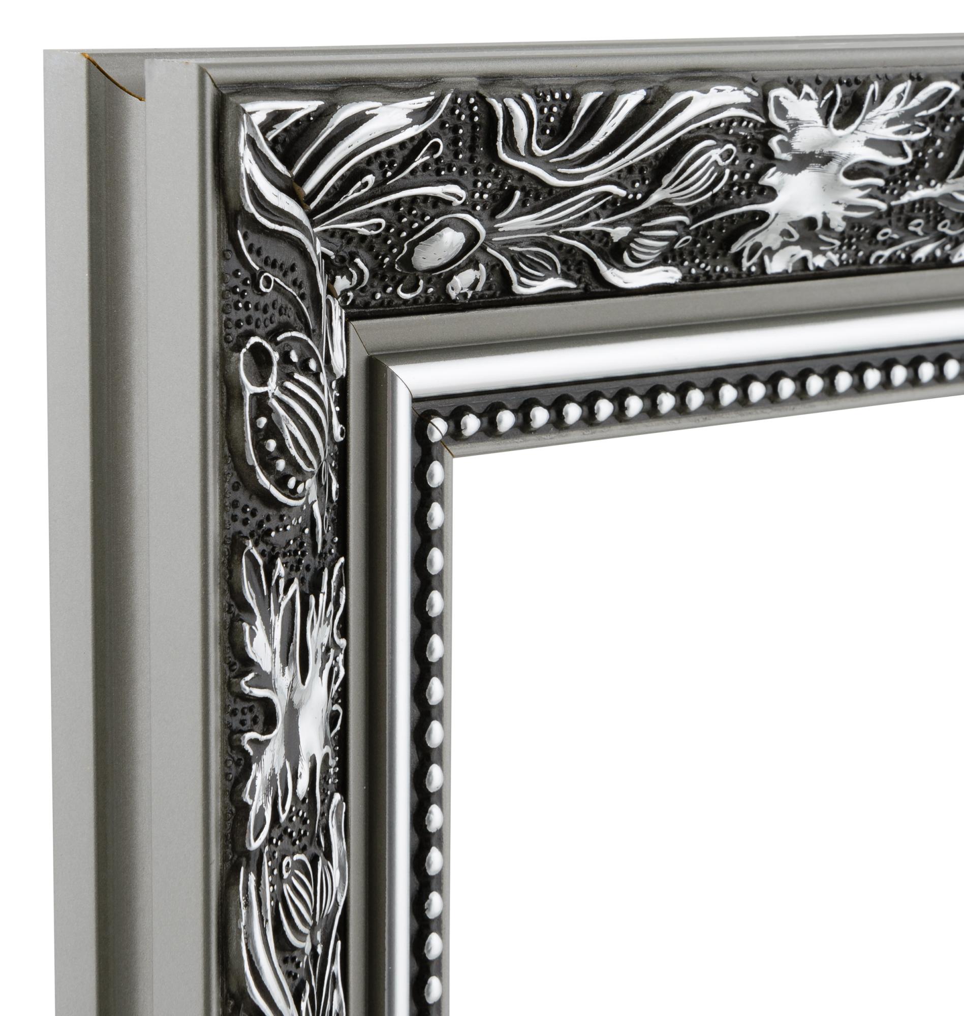 Spiegle dich mit Stil in diesem wundervollen Spiegel, der in Schwarz und Silber erhältlich ist! Der Rahmen des Spiegels trägt sowohl matte als auch glänzende Details und ist damit sehr dekorativ. Auf der Vorderseite befindet sich ein breiter Abschnitt mit Blattmuster, glatte Partien in mattem und glänzendem Silber und ein Perlenband, das direkt neben dem Glas verläuft. Da der Spiegel von qualifiziertem Personal in unserer eigenen Rahmenwerkstatt hergestellt wird, erwartet dich ein qualitativ hochwertiges Produkt!