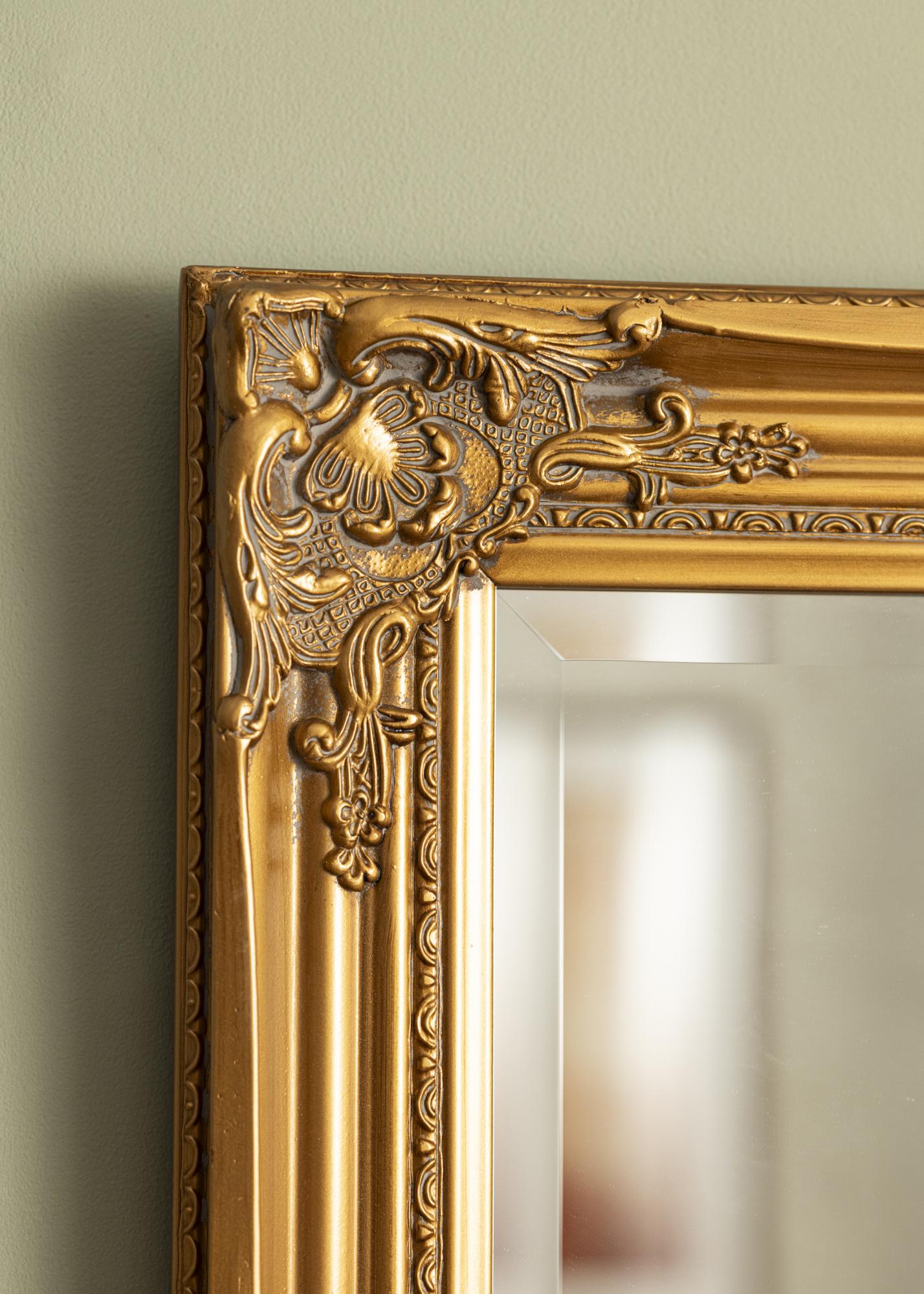Der Spiegel Antique Gold ist ein Spiegel mit traditionellem Format. Er hat einen Holzrahmen mit wunderschön geformten klassischen Verzierungen, die in Gips gegossen und dann am Rahmen angebracht wurden. Dieser Rahmen macht den Spiegel zu einem tollen Deko-Element, das alle Blicke auf sich ziehen wird.