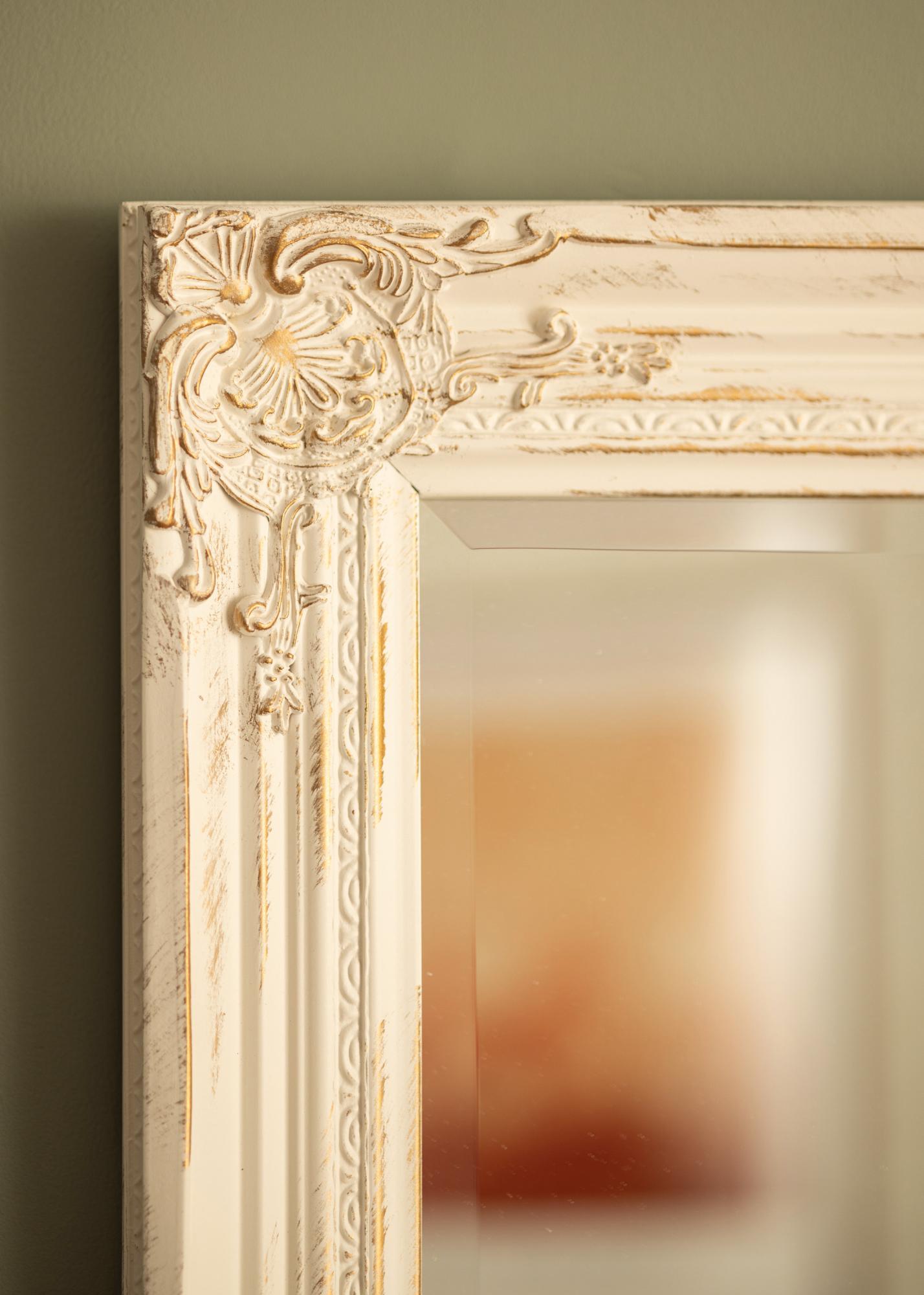 Der Spiegel Antique Weiß ist ein Spiegel mit traditionellem Format. Er hat einen Holzrahmen mit wunderschön geformten klassischen Verzierungen, die in Gips gegossen und dann am Rahmen angebracht wurden. Dieser Rahmen macht den Spiegel zu einem tollen Deko-Element, das alle Blicke auf sich ziehen wird.