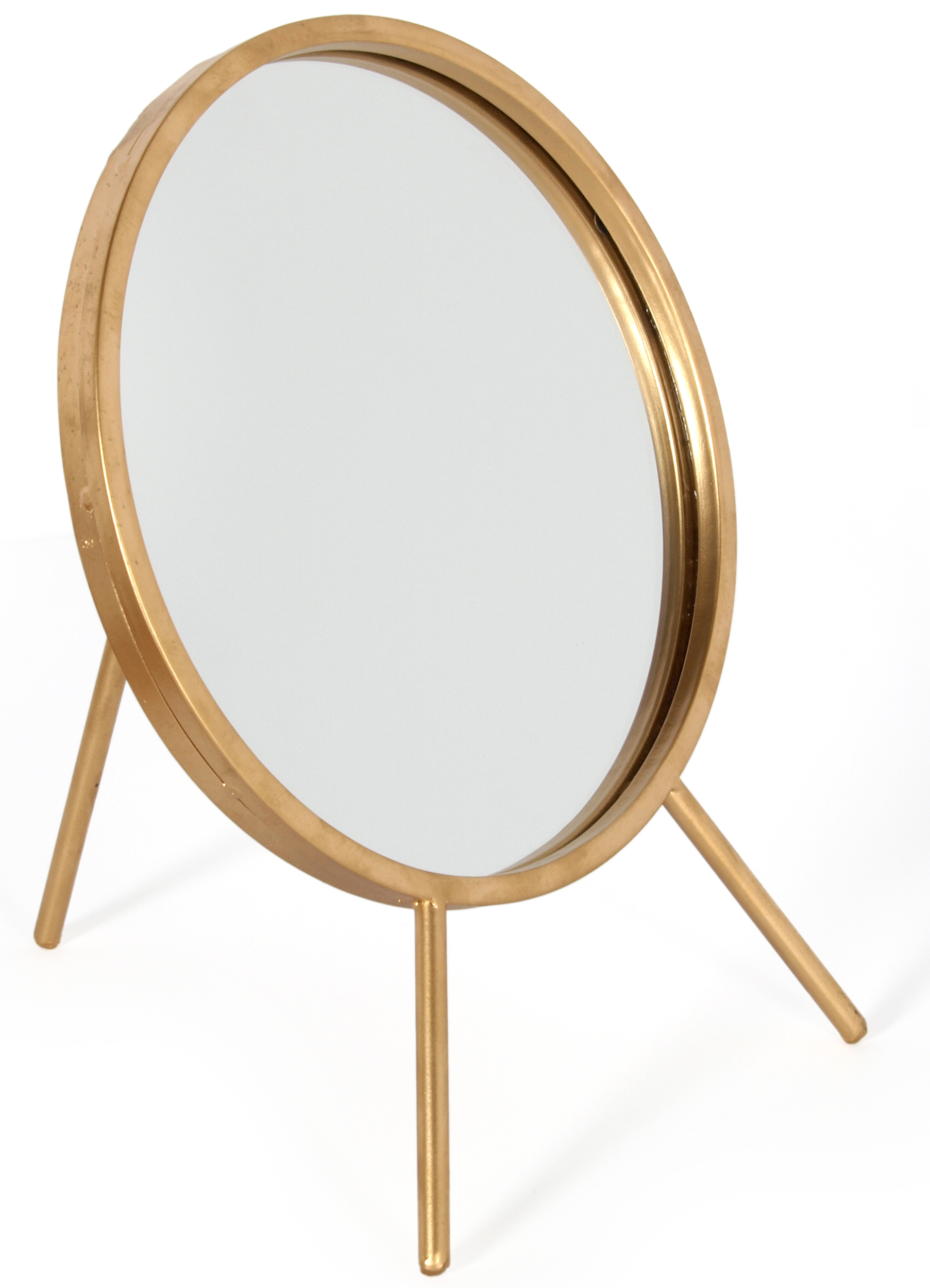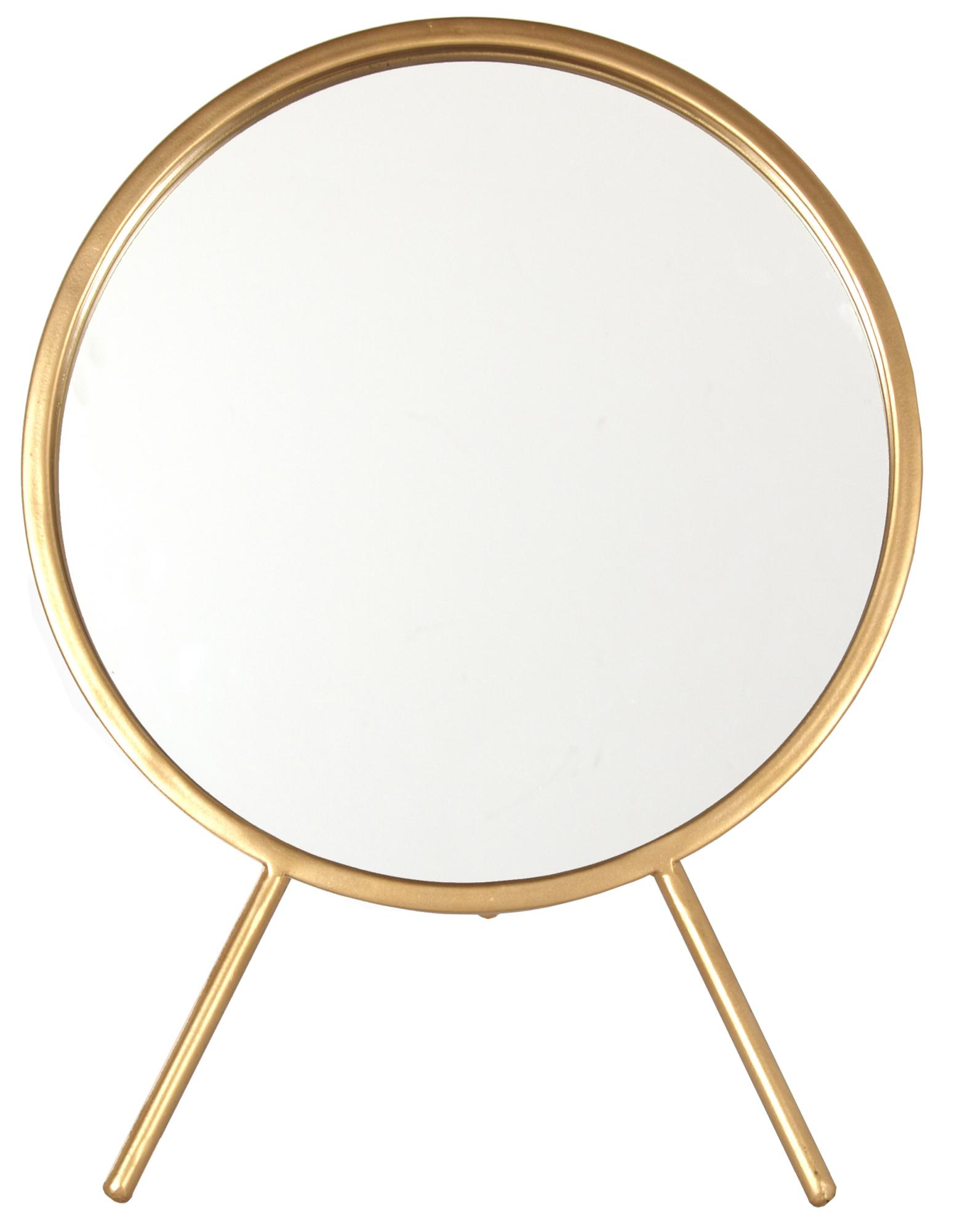 Dieser robuste Tischspiegel mit dänischem Design hat einen Durchmesser von 30 cm und einen messingfarbenen Rahmen. Steht stabil und wird zu einem schönen Detail in deinem Zuhause.