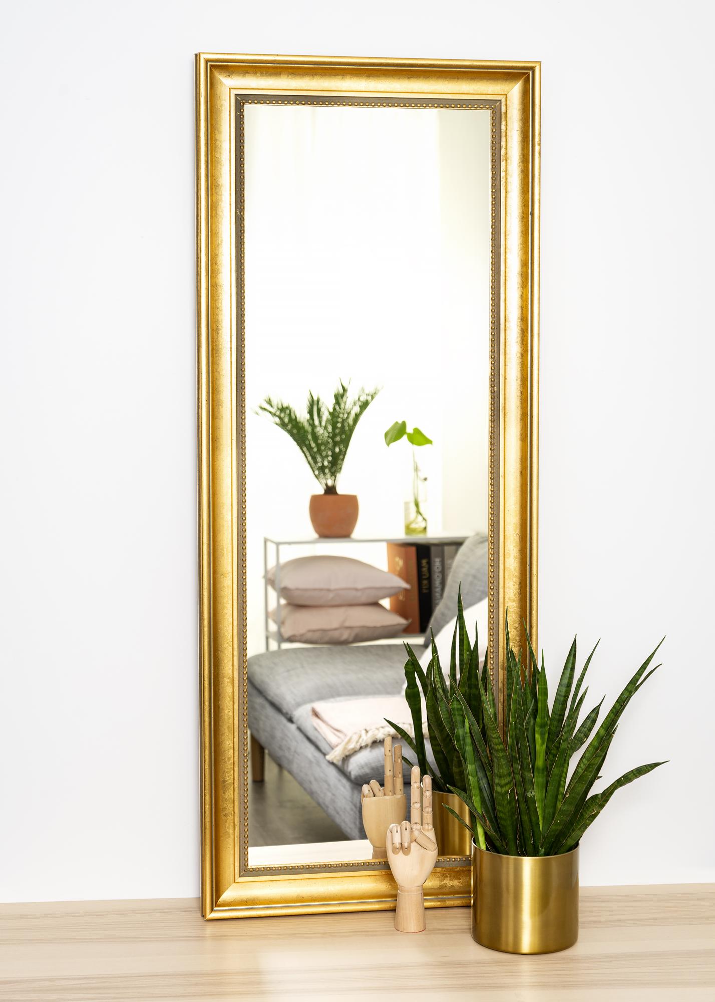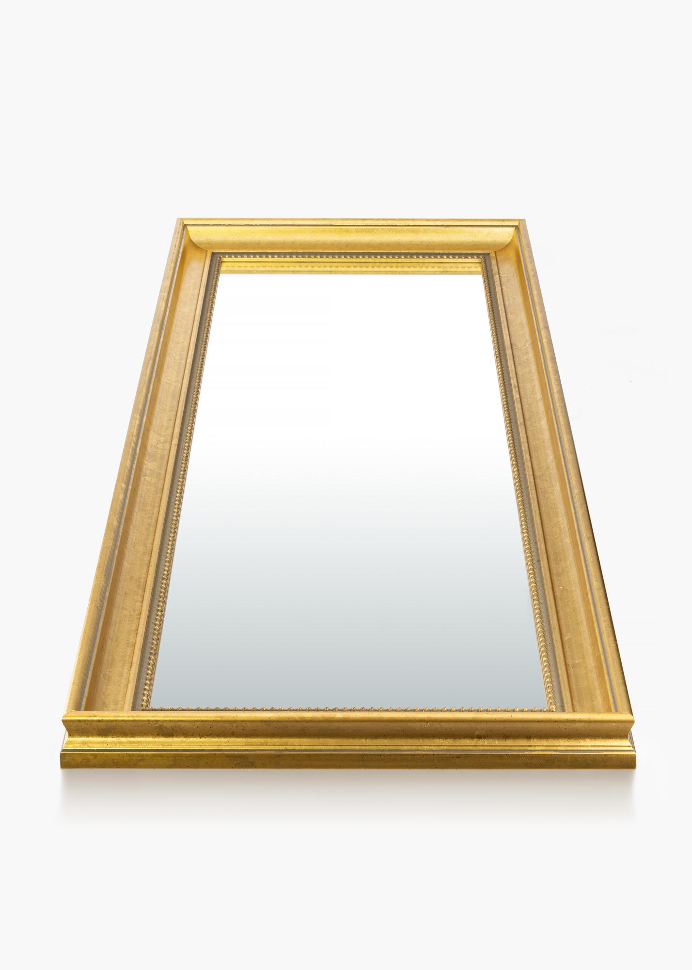 Kaufen Sie sich einen edlen Spiegel und verleihen Sie Ihrem Flur, Ihrem Wohnzimmer oder Ihrem Badezimmer ein besonders luxuriöses Flair! Dieser stilvolle Spiegel ist in diversen Größen erhältlich, sodass Sie schnell und einfach die Ausführung finden, die genau für Ihre Zwecke geeignet ist. Der Spiegelrahmen hat ein klassisches Design mit breitem Profil und einem diskreten Perlenmuster, das um das Glas verläuft. Das Holz stammt aus nachhaltiger Forstwirtschaft und hat eine wunderschöne, goldfarbene Patina.