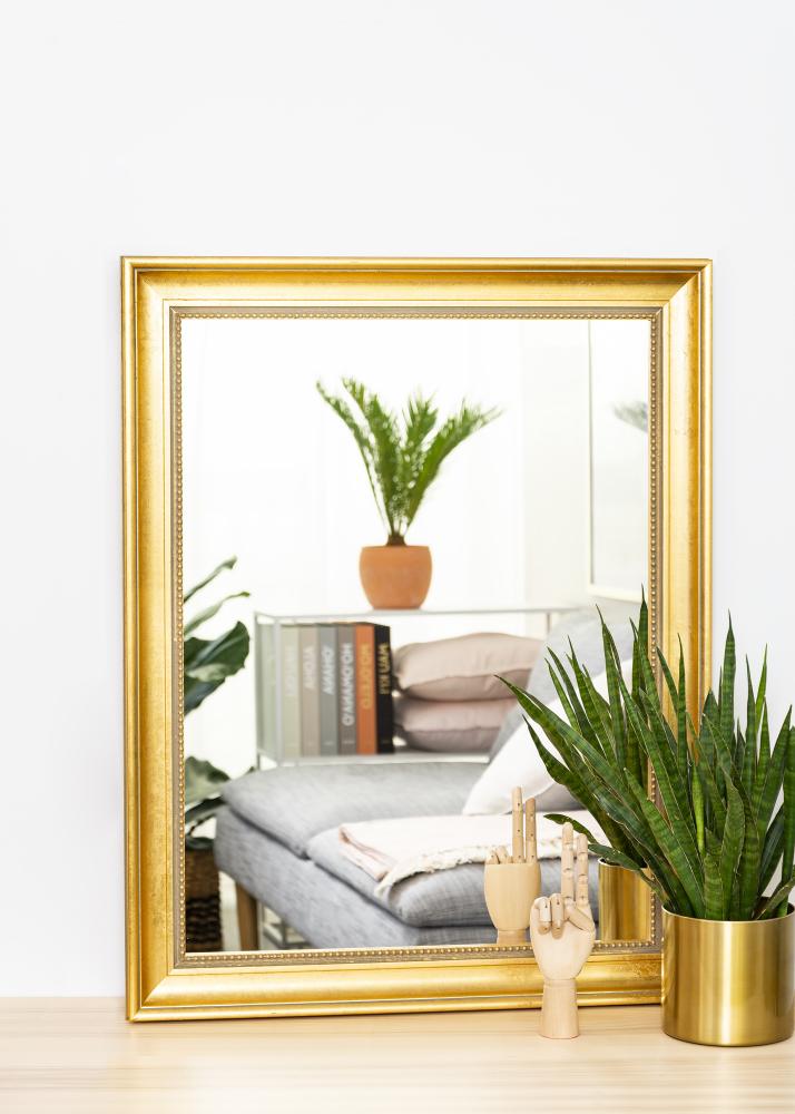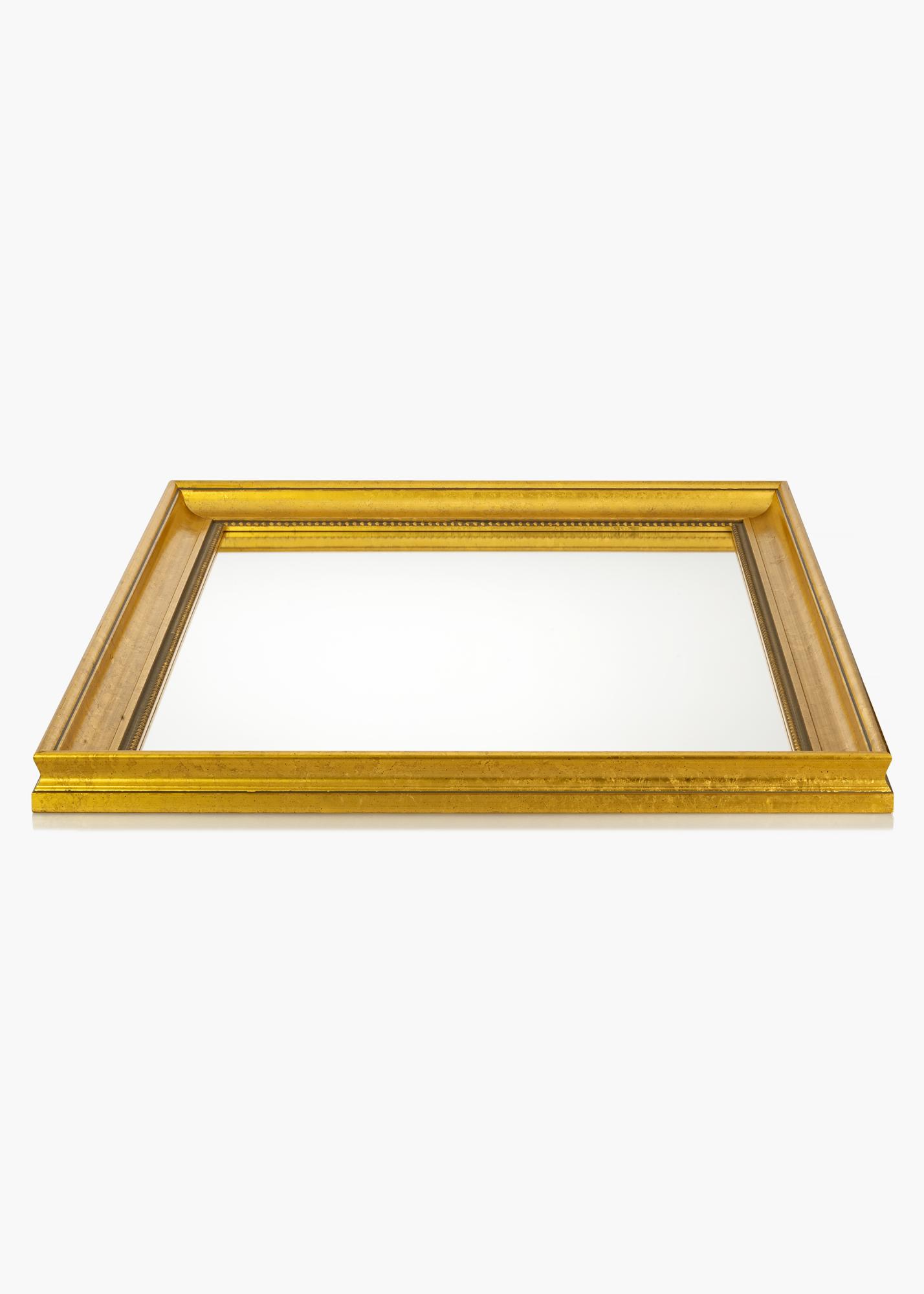 Kaufen Sie sich einen edlen Spiegel und verleihen Sie Ihrem Flur, Ihrem Wohnzimmer oder Ihrem Badezimmer ein besonders luxuriöses Flair! Dieser stilvolle Spiegel ist in diversen Größen erhältlich, sodass Sie schnell und einfach die Ausführung finden, die genau für Ihre Zwecke geeignet ist. Der Spiegelrahmen hat ein klassisches Design mit breitem Profil und einem diskreten Perlenmuster, das um das Glas verläuft. Das Holz stammt aus nachhaltiger Forstwirtschaft und hat eine wunderschöne, goldfarbene Patina.