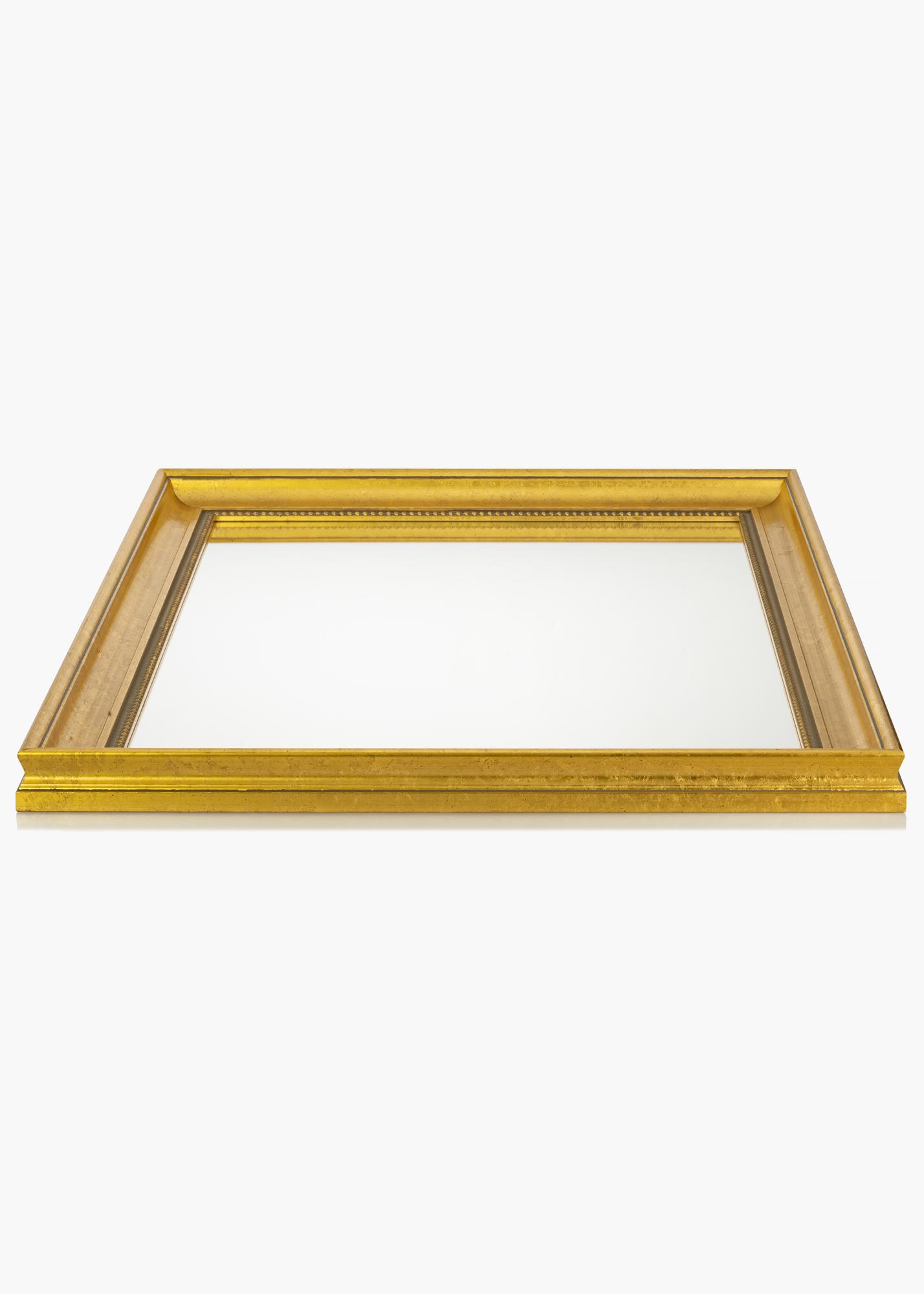 Kaufen Sie sich einen edlen Spiegel und verleihen Sie Ihrem Flur, Ihrem Wohnzimmer oder Ihrem Badezimmer ein besonders luxuriöses Flair! Dieser stilvolle Spiegel ist in diversen Größen erhältlich, sodass Sie schnell und einfach die Ausführung finden, die genau für Ihre Zwecke geeignet ist. Der Spiegelrahmen hat ein klassisches Design mit breitem Profil und einem diskreten Perlenmuster, das um das Glas verläuft. Das Holz stammt aus nachhaltiger Forstwirtschaft und hat eine wunderschöne, goldfarbene Patina.