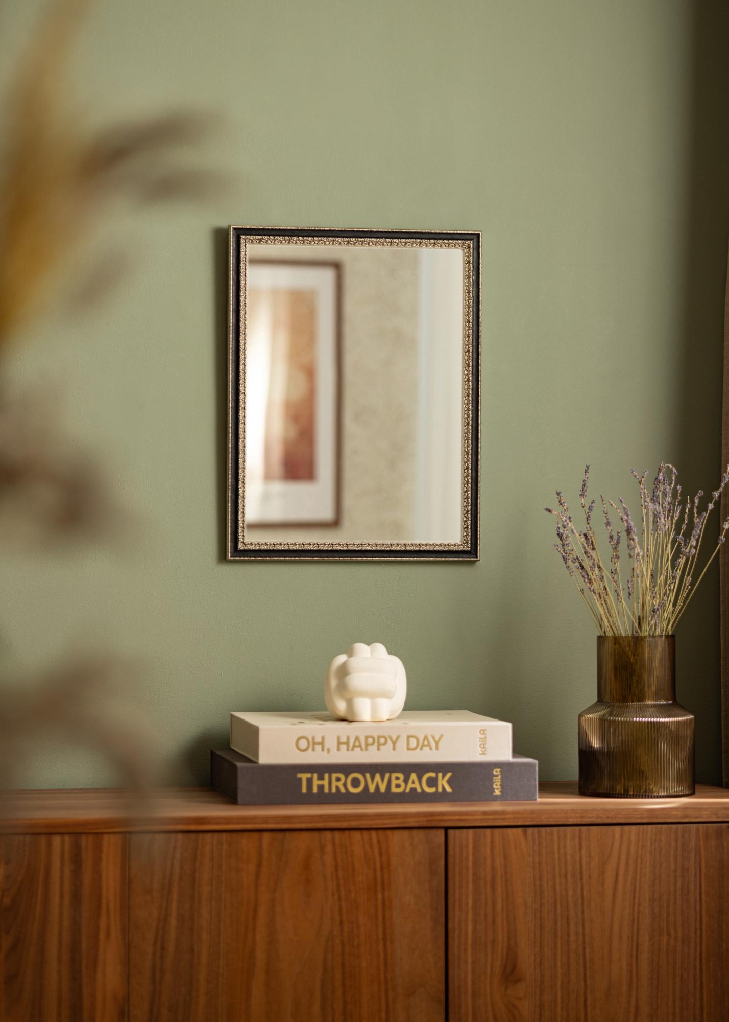 Der Rahmen ist aus Holz gefertigt und hat eine Antikgold-Finish mit dekorativen Ornamenten, die dem Spiegel ein klassisches und zeitloses Gefühl verleihen. Die verzierten Details werden durch den schwarzen Rand weiter hervorgehoben, was ein harmonisches Gleichgewicht zwischen dem Antiken und dem Modernen schafft.