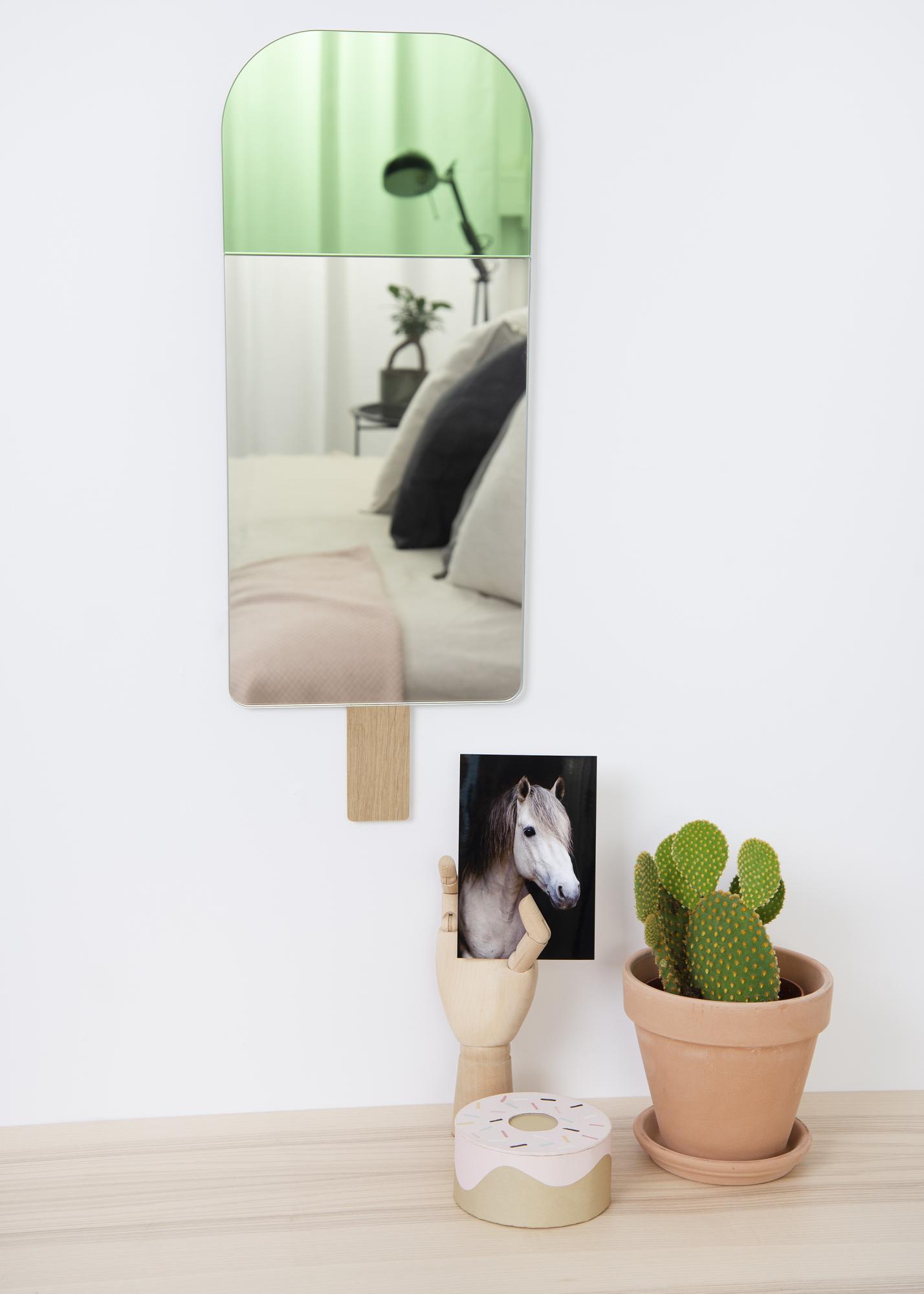 Der Wandspiegel in Stieleis-Form ist aus hochwertigem Spiegelglas gefertigt. Der Holzstiel im unteren Teil des Spiegels ist aus unbehandeltem Eichenholz hergestellt. Den Spiegel mit dem andersfarbigen oberen Teil gibt es in verschiedenen Farben; bei dieser Variante ist die Farbe des oberen Teils Exotic Green.