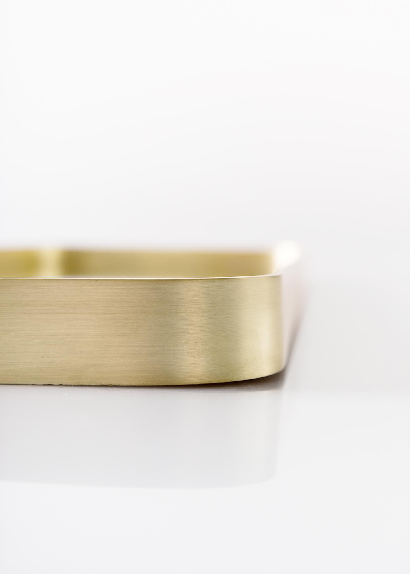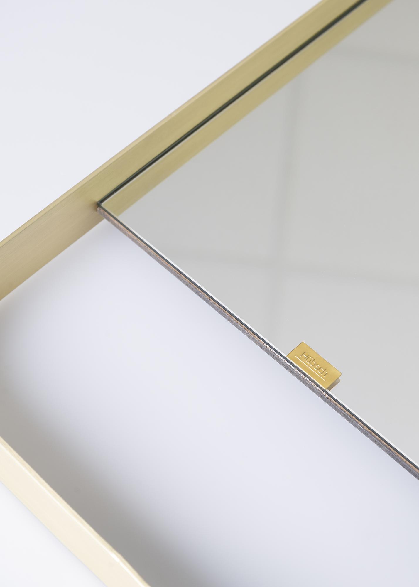 Eleganter Spiegel mit eigenem Stil und dekorativem, messingfarbenen Rahmen mit abegerundeten Ecken. Das Spiegelglas füllt nicht den gesamten Raum innerhalb des Rahmens aus, was dem Spiegel eine interessante, ausgefallenere Note verleiht.