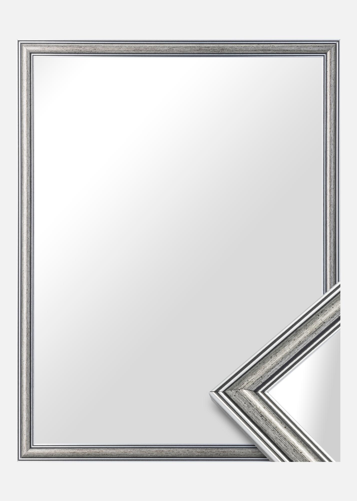 Frigg ist ein Silberrahmen mit schwarzen Linien und schwärzlichen Komponenten. Perfekt, wenn du auf der Suche nach einem traditionellen Silberrahmen für deinen Spiegel bist.