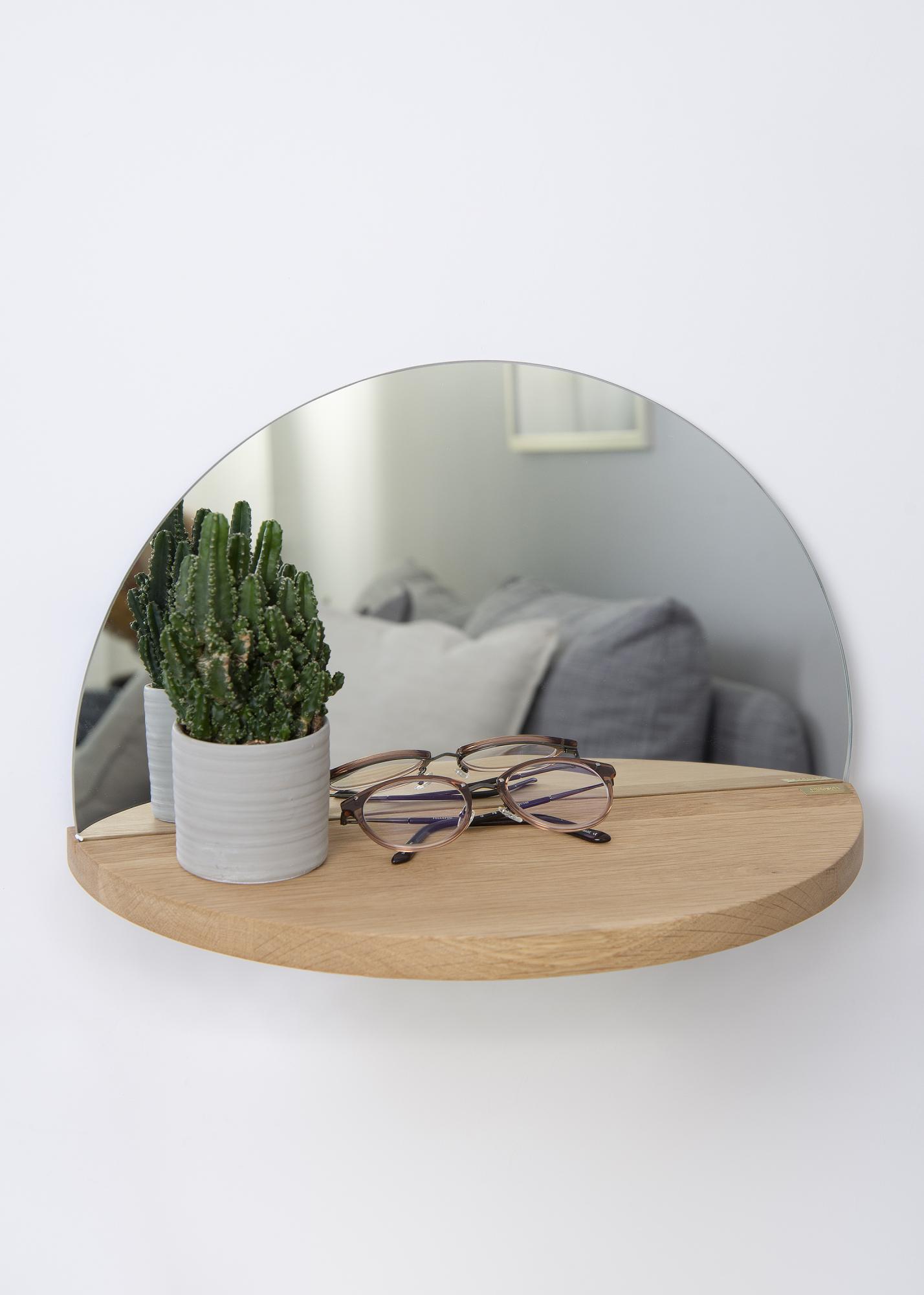 Half Circle Shelf ist Spiegel und Regal in einem. Dekorativer Spiegel mit Regalfunktion als multifunktionelles, stilvolles Einrichtungsaccessoire. Das halbkreisförmige Spiegelglas trifft auf eine halbkreisförmige Regalablage aus Eiche. Perfekt geeignet als funktionelle Wanddeko, ein ausgefallenerer Wandschmuck und praktischer Ablageplats för kleine Dinge wie z.B. Brille, Schlüssel o.ä.