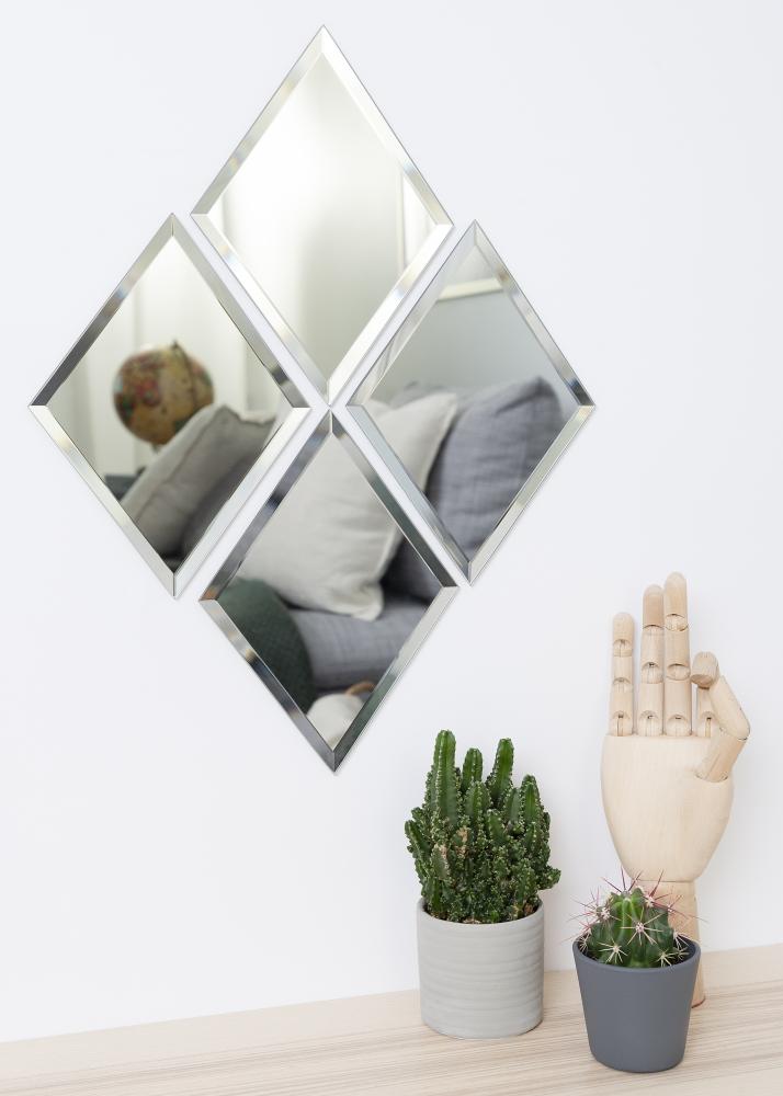 4er-Pack hübsche Spiegel im kleineren Format von House Doctor. Mit ihrer Diamantform eigen sich diese Spiegel perfekt, um deinen persönlichen Stil zu kreieren. Die Spiegel lassen sich leicht mit dem mitgelieferten doppelseitigen Klebeband anbringen und sind sehr einfach zu platzieren. Da die Spiegel auch für Nassräume zertifiziert sind, kannst du sie auch im Badezimmer verwenden.