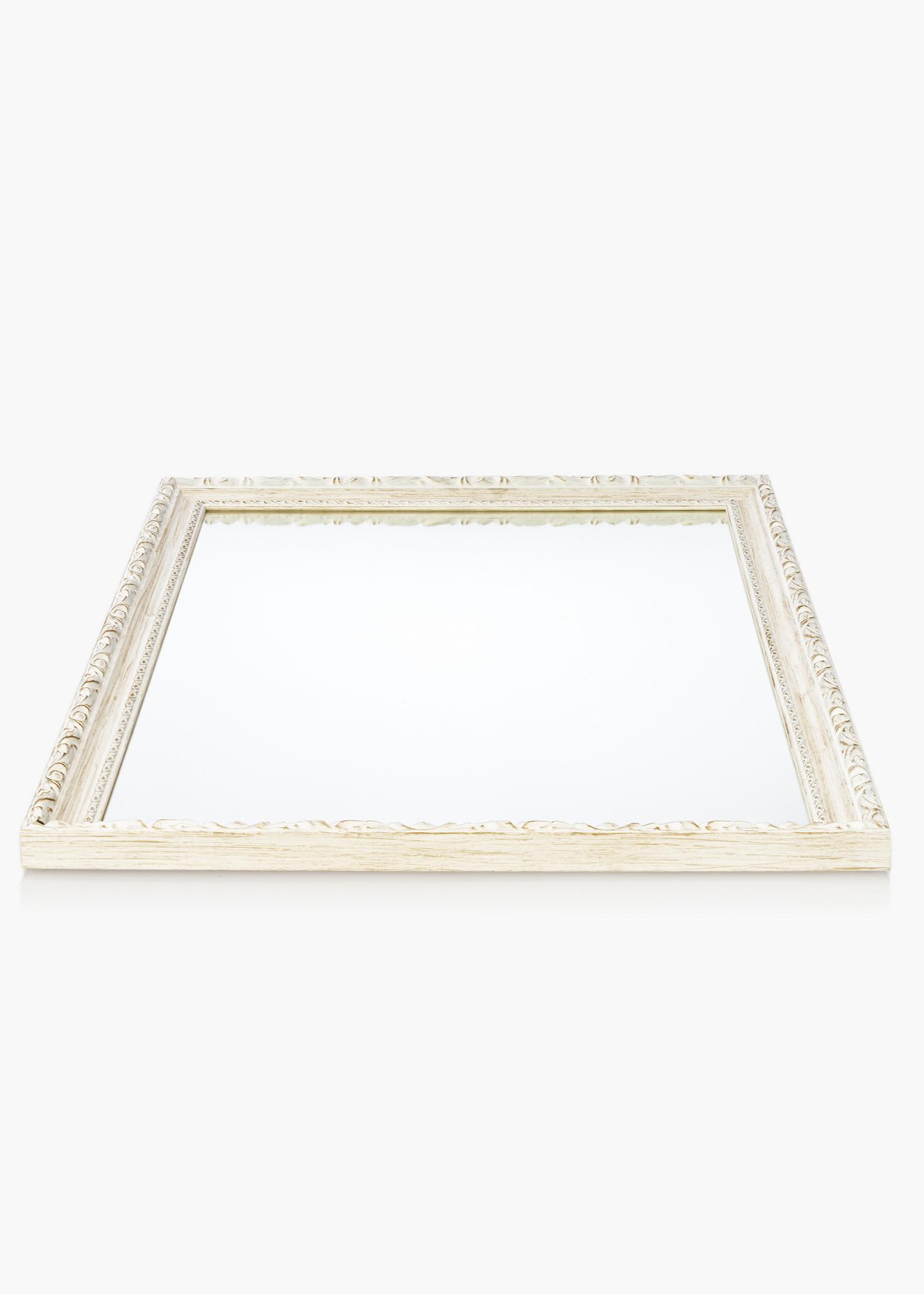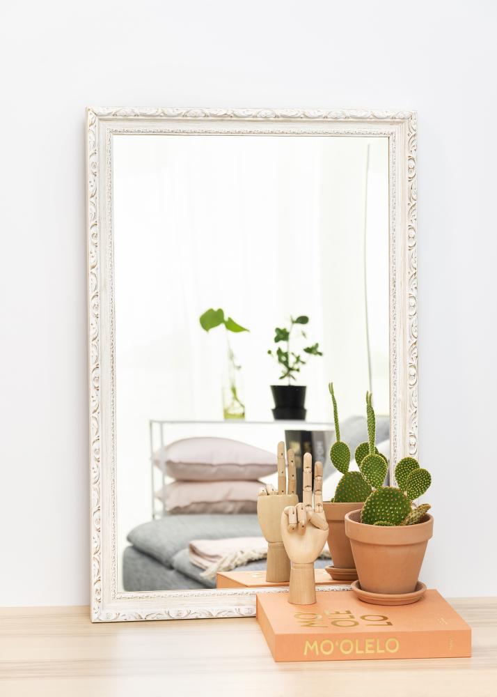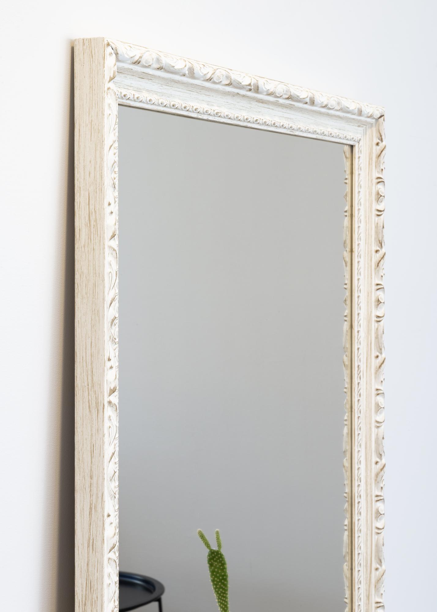 Weißer Spiegel im antiken Stil mit sichtbarer Holzmaserung und einer Breite von 40 mm. Eine ausgezeichnete Wahl, wenn du einen Spiegel suchst, der auffällt und Platz einnimmt.