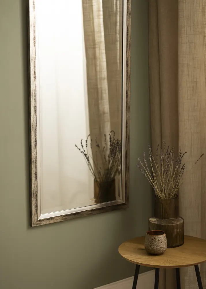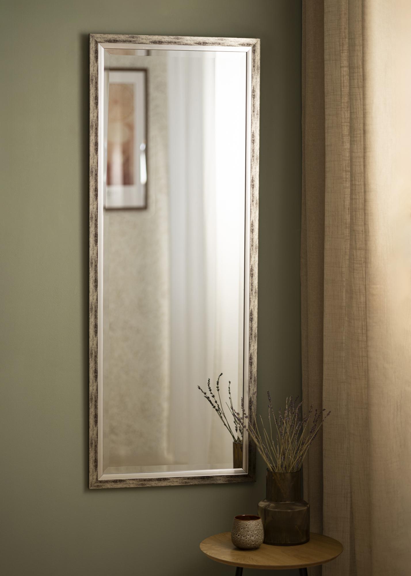 Gestalten Sie Ihre Wand mit einem schönen Spiegel! Dieses Modell besteht aus einem silberfarbenen Rahmen, einer breiten "grob bearbeiteten" Außenleiste und einer weißen Innenleiste in der Nähe vom Spiegelglas. Das Glas ist zu den Seiten angewinkelt und lässt damit den Raum, in dem der Spiegel hängt, größer erscheinen. Das Design eignet sich sowohl für einen ländlichen als auch für einen modernen Einrichtungsstil. Sie können zwischen den Größen 40x80 cm, 60x80 cm und 50x130 cm auswählen.