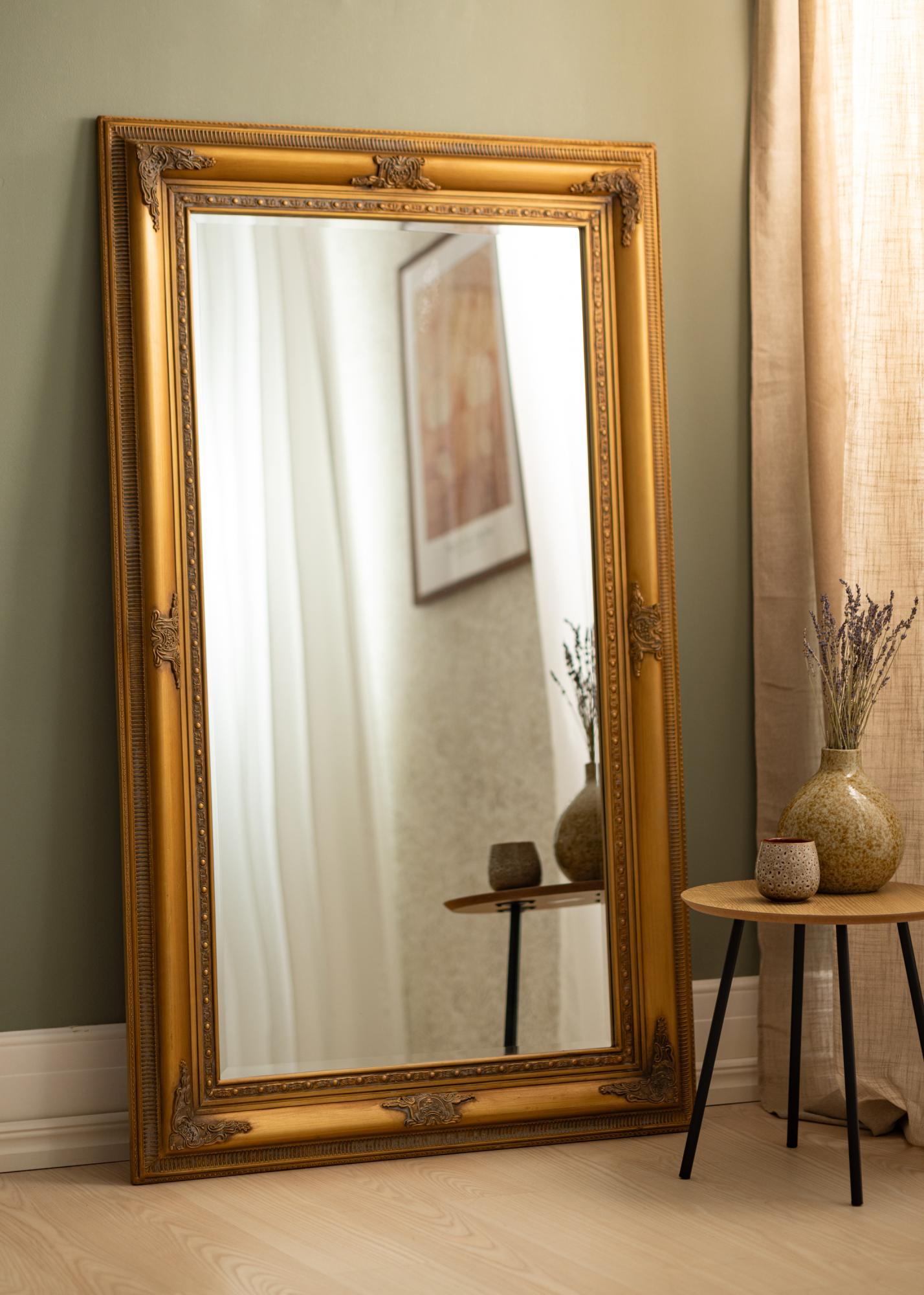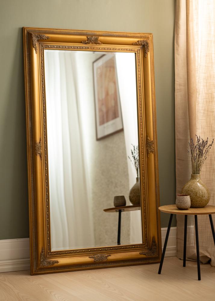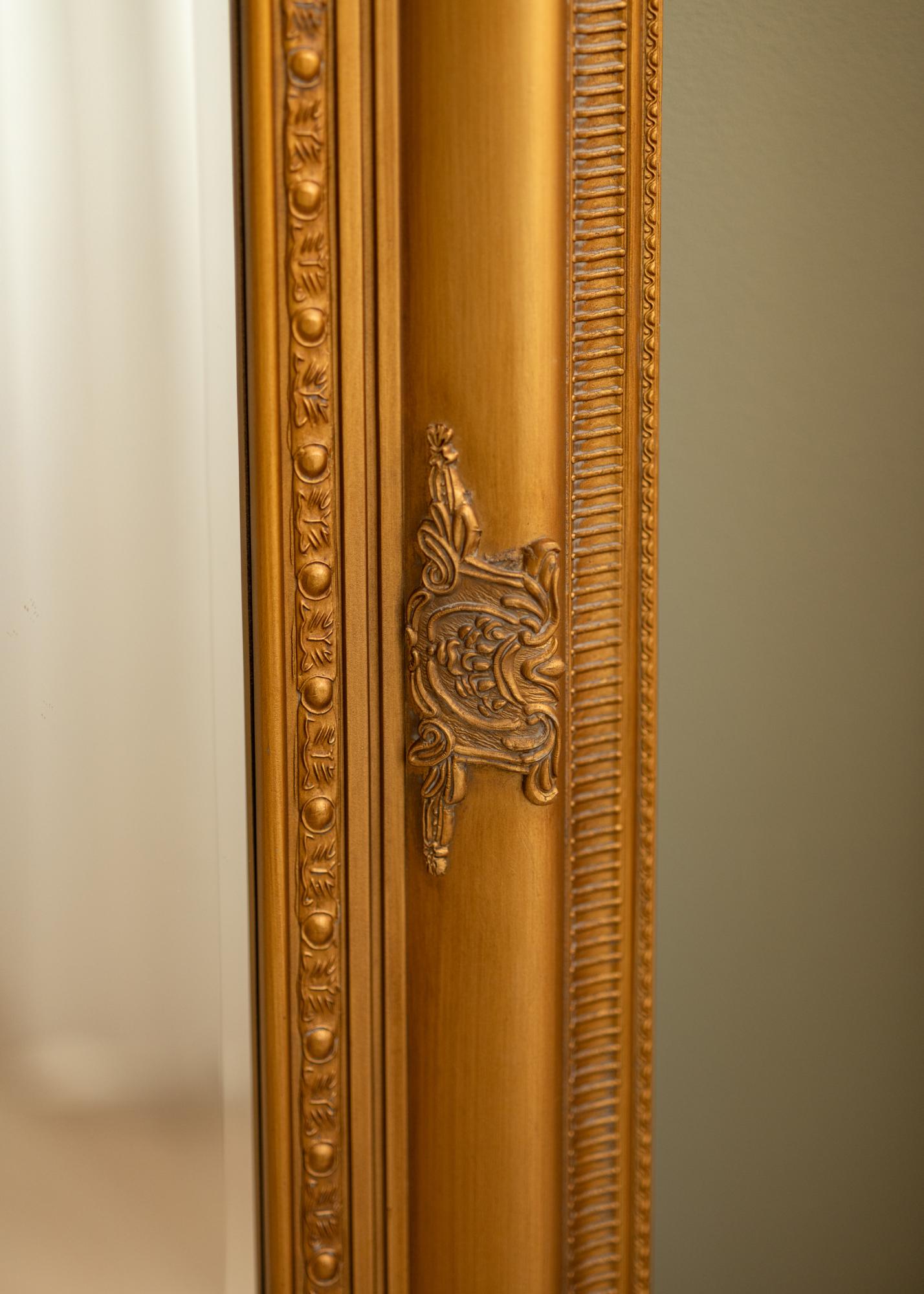 Spiegel mit schönem Profil in Gold mit einer antiken Note, verziert mit Blumenornamenten. Der klassische Stil des Spiegelrahmens passt hervorragend zu Einrichtungsstilen mit älteren Möbeln, kann aber auch verwendet werden, um einen spannenden Kontrast in einem stilvollen, modern eingerichteten Zuhause zu schaffen. Der Spiegel lässt sich wunderbar im Flur, Schlafzimmer oder in einem begehbaren Kleiderschrank aufhängen und wird gemeinsam mit Accessoires in Messing- oder Goldtönen schön hervorgehoben.