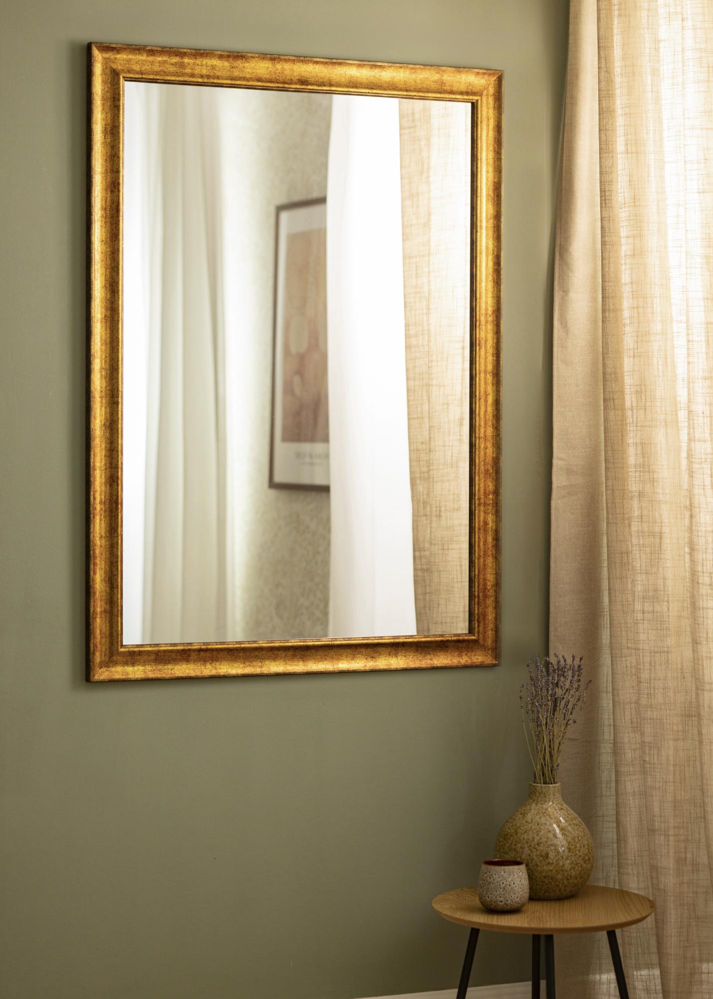Dieser schöne, antik anmutende Wandspiegel überzeugt durch den goldfarbenen Kunststoffrahmen aus Komposit. Der Rahmen im Used-Look zeichnet sich durch seinen stilvollen Charakter aus und lässt sich wunderbar in jede Wohneinrichtung integrieren. Das schöne Design dieses goldenen Wandspiegels sorgt für ein Mehr an Wohnlichkeit, Eleganz und Wärme. Die praktische Halterung auf der Rückseite des Spiegels erlaubt die Aufhängung im Hoch- als auch im Querformat. Die Größe des Spiegels beträgt 70x100 cm.