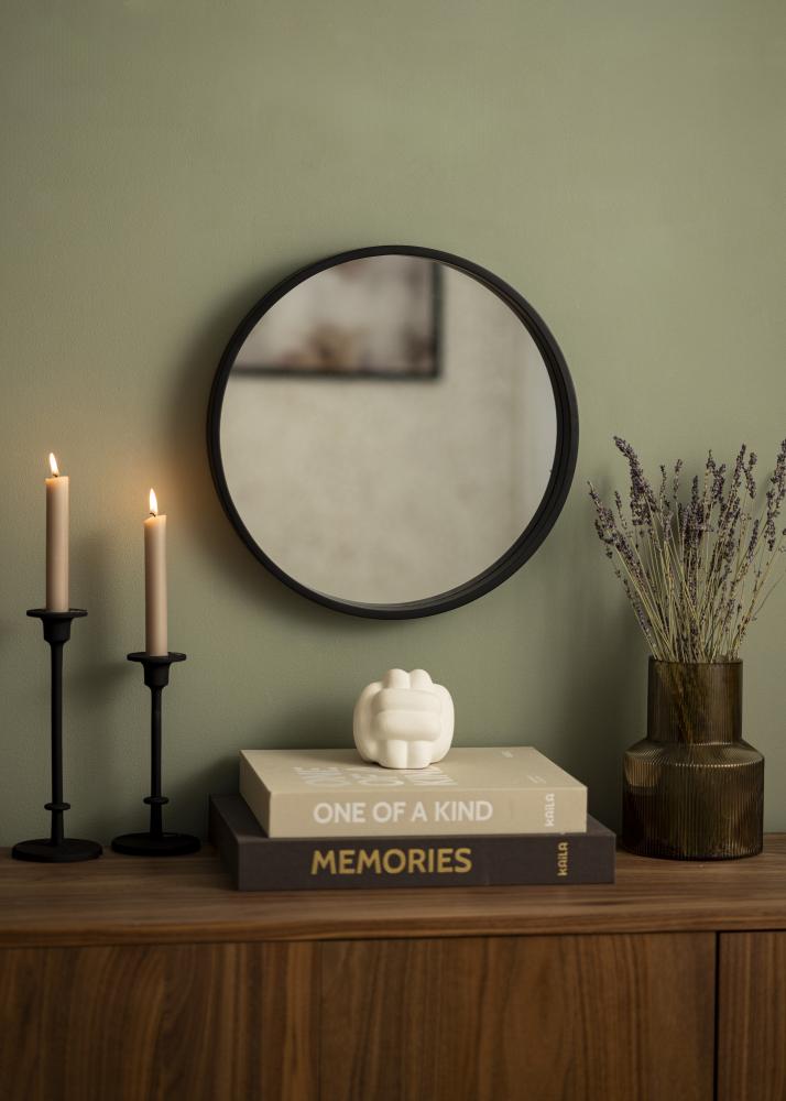 Schicker kreisrunder schwarzer Spiegel in verschiedenen Größen. Einer unserer Spiegelfavoriten.