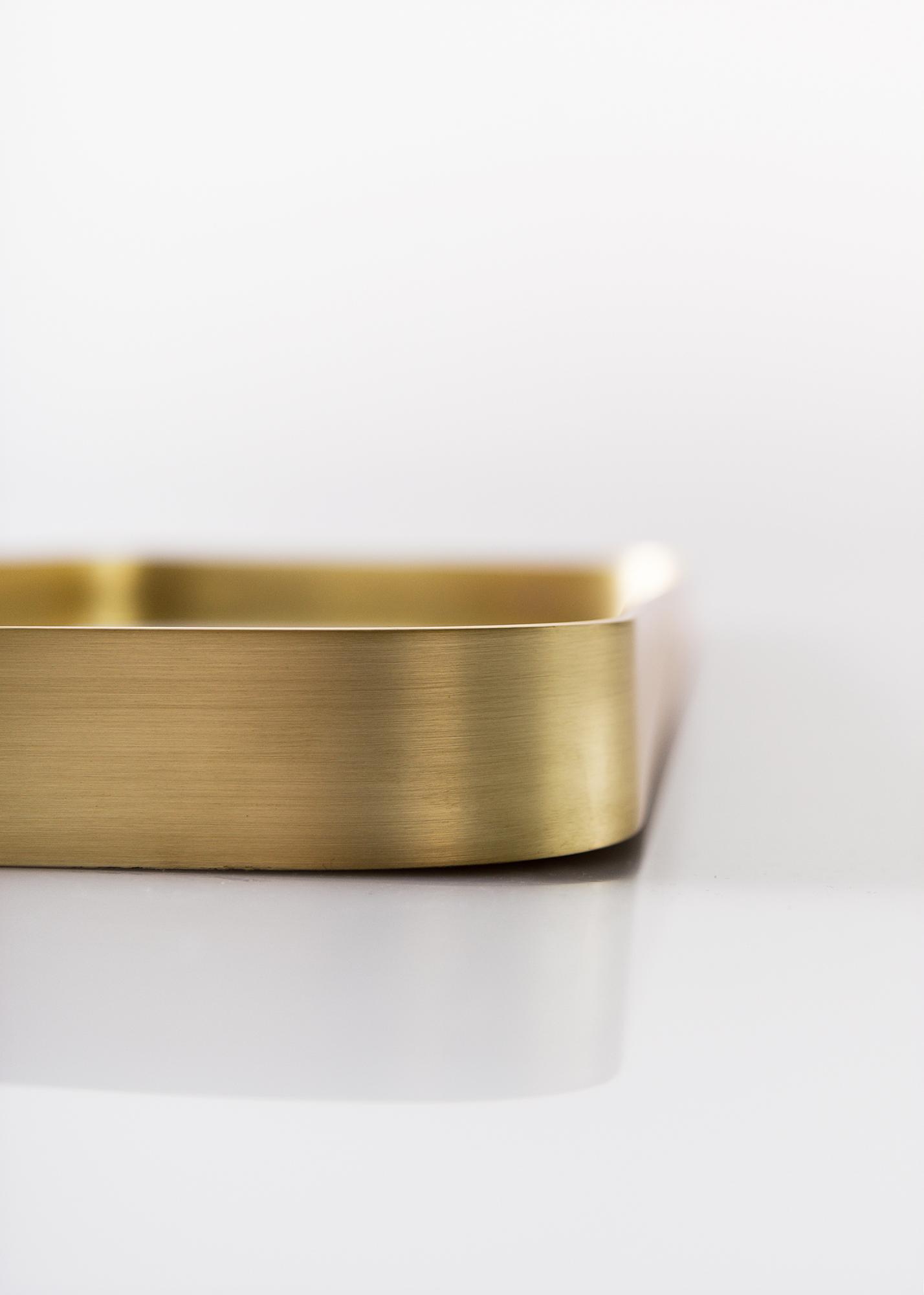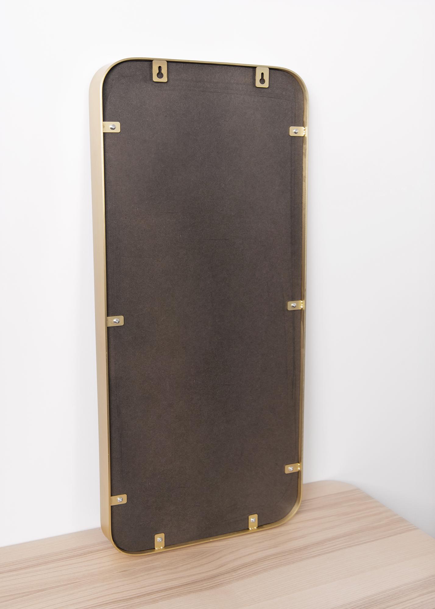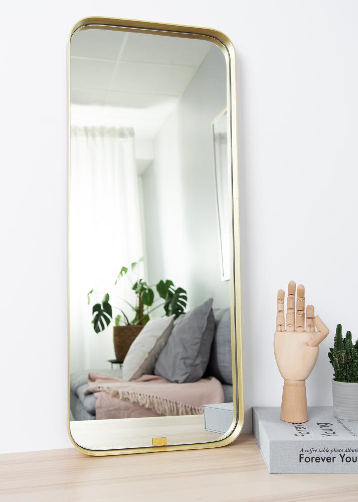 Rechteckiger Spiegel. Schönes, stilvolles Design aus Dänemark. Mit Rahmen aus messingfarbenem Metall und abgerundeten Ecken. Elegant und weich im Ausdruck. Der Spiegel kann an der Wand befestigt werden oder an die Wand gelehnt stehen, auf einer Kommode oder einem Regal. Dieser hübsche Wandspiegel kommt aus dem Hause Hübsch, der dänischen Marke für Wohndesign.
