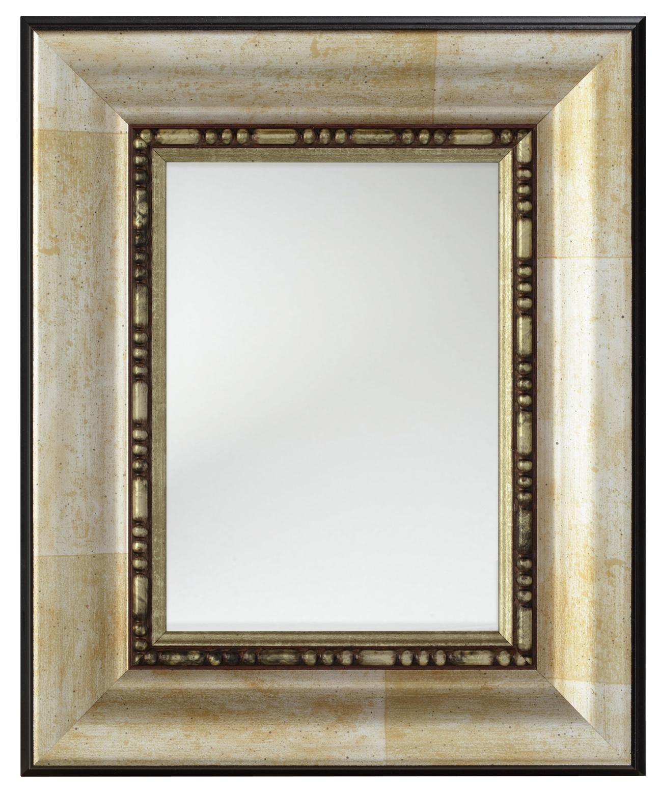 Klassischer Spiegelrahmen mit schwarzen Seiten, einer profilierten Silberfarbe auf der Vorderseite sowie Dekorationen nahe des Spiegelglases.