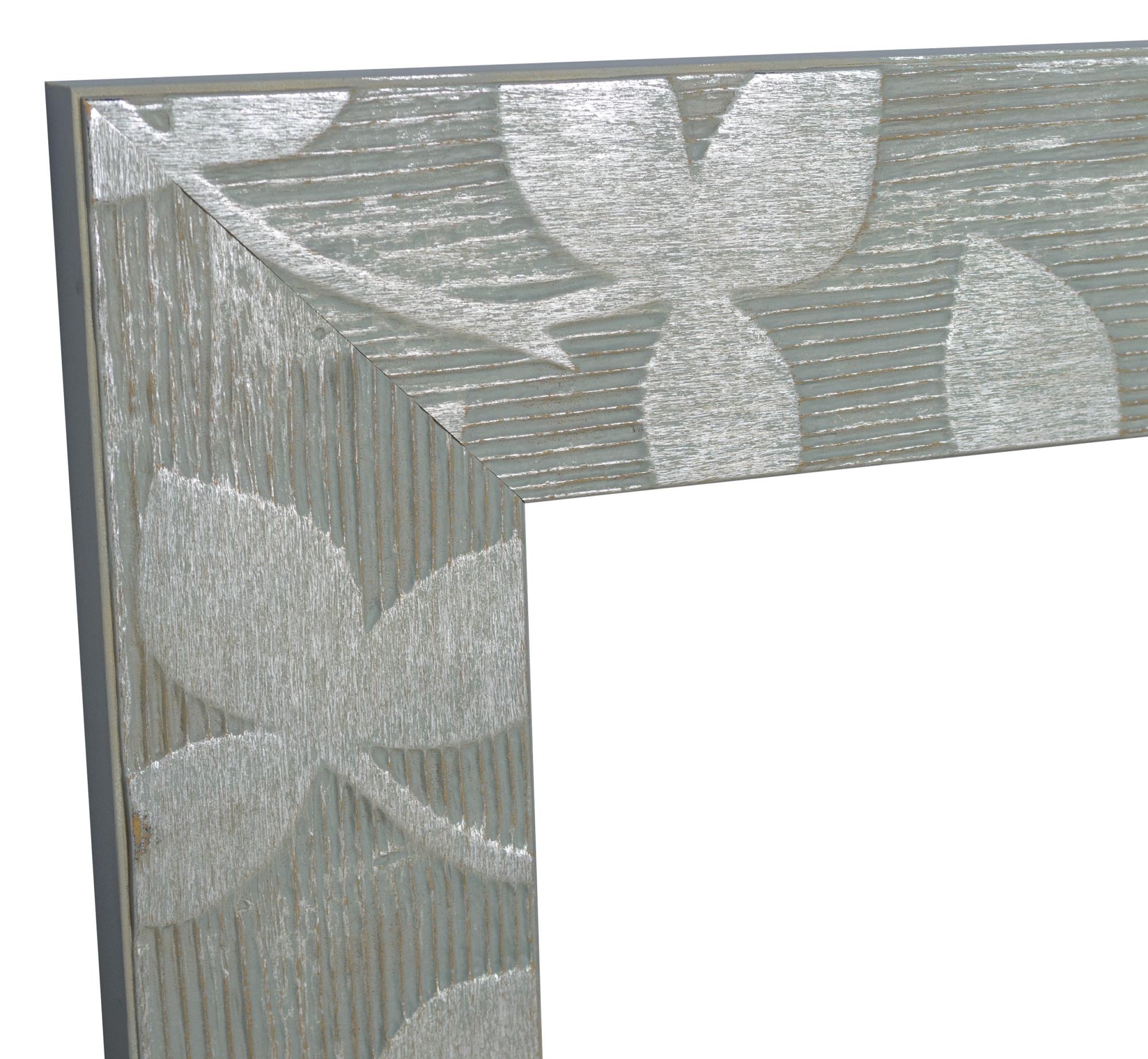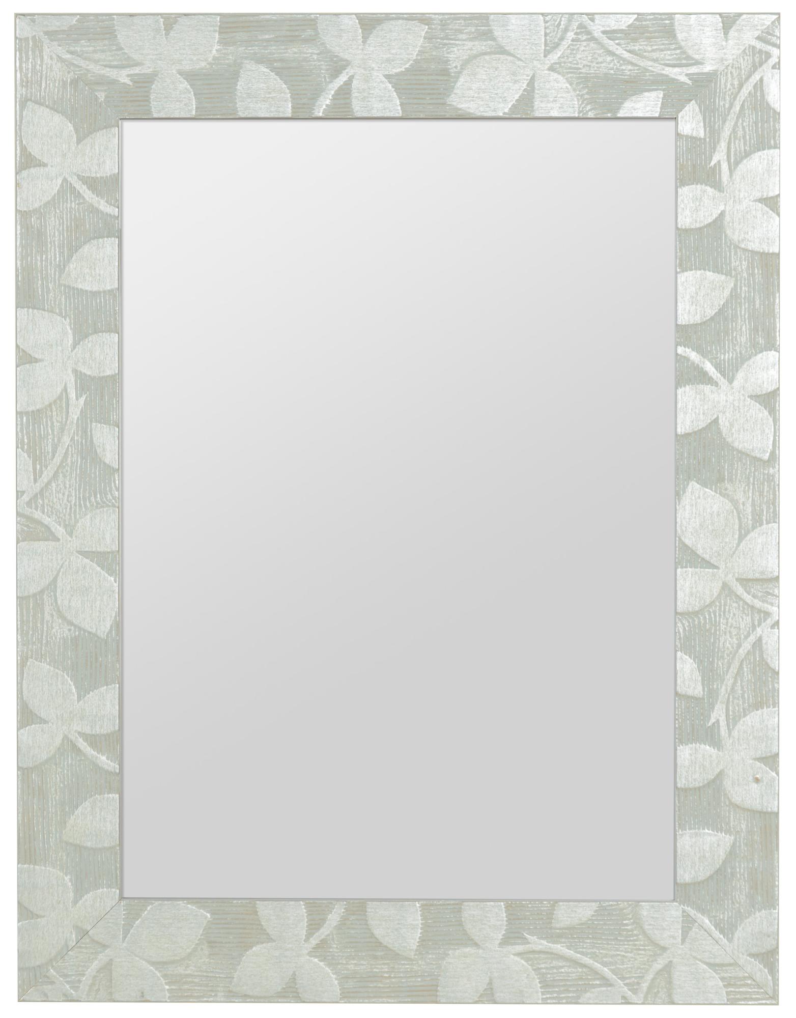 Dekorieren Sie Ihr Zuhause mit Grautönen, um sicher zu gehen, dass die Farben zueinander passen. Hier haben wir einen Spiegel von hoher Qualität, der eine angenehme hellgraue Nuance hat. Der Spiegelrahmen ist aus FSC-zertifiziertem Holz mit einer gerillten Oberfläche und dekorativem Blattmuster. Diesen Spiegel gibt es in Größen fürs Badezimmer und den Flur.