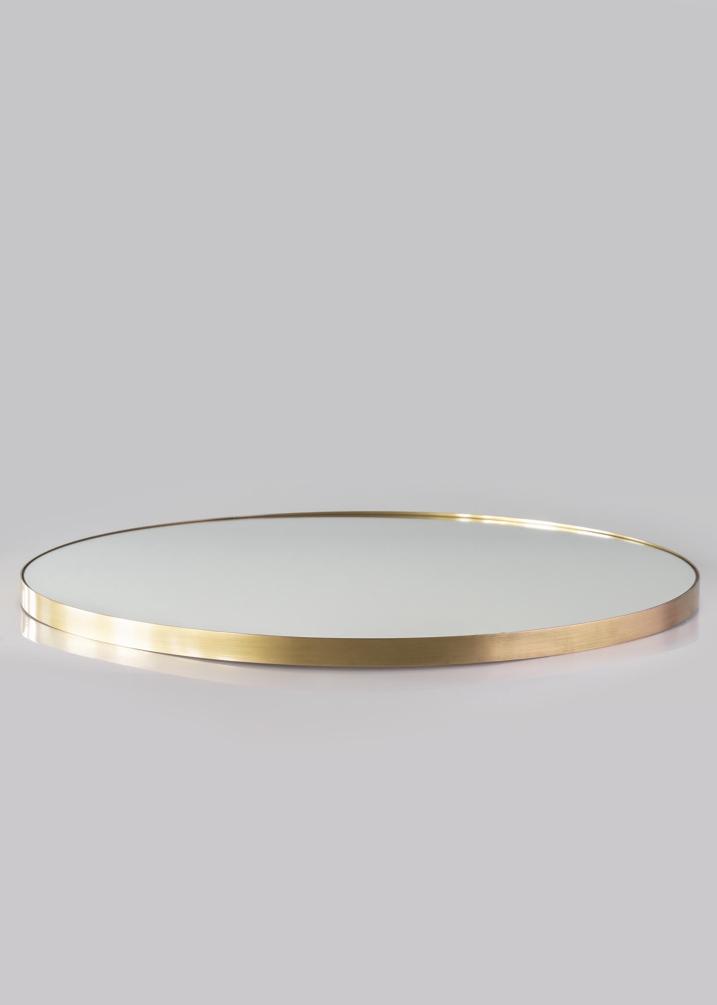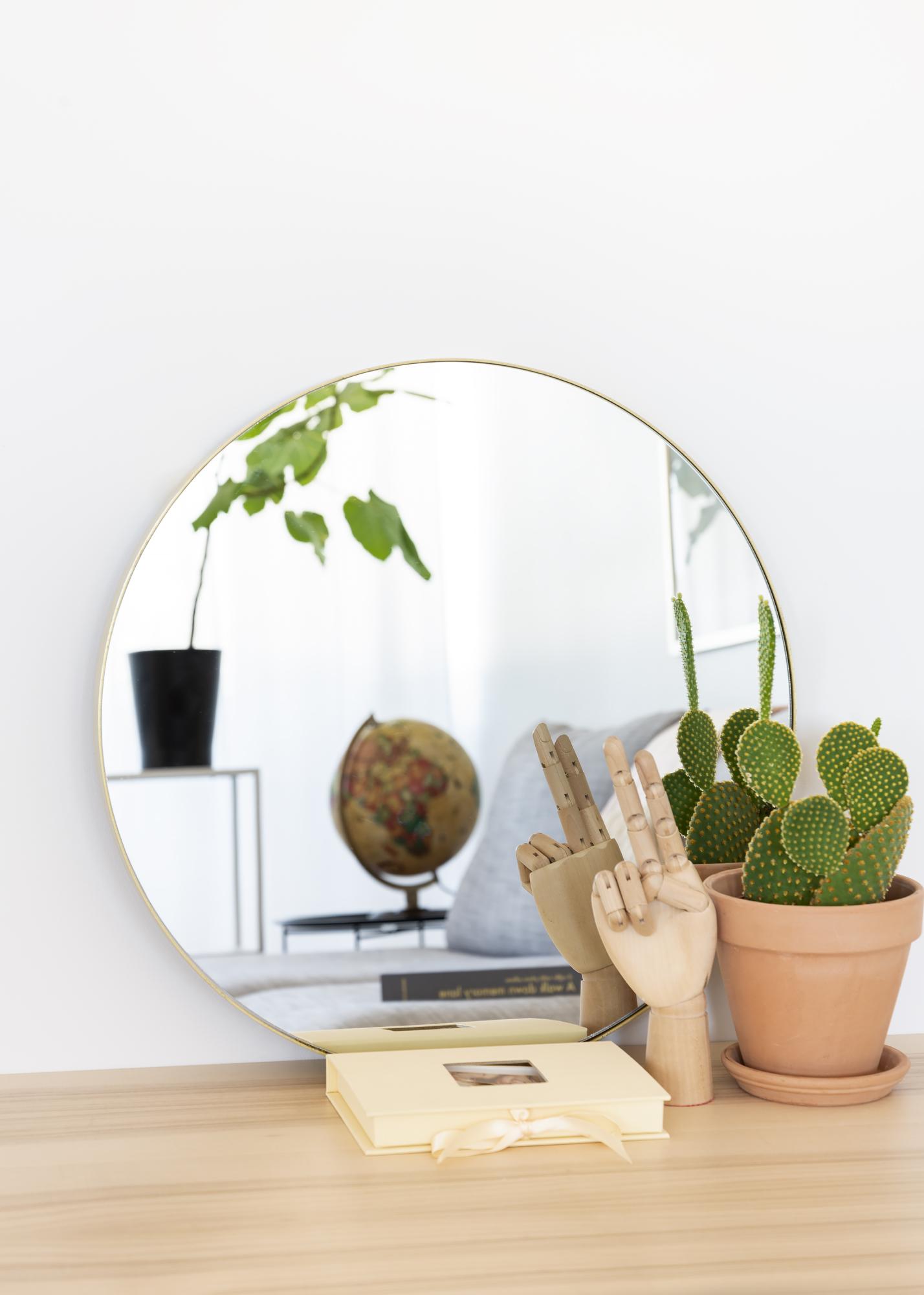 Dieser elegante und doch schlichte Rundspiegel passt in jeden Wohnraum, ob als runder Deko-Wanndspiegel im Wohnzimmer oder im Hausflur. Die weiche, runde Form des Spiegels sorgt zusammen mit dem diskreten, schmalen Messingrahmen für zeitlose Eleganz.