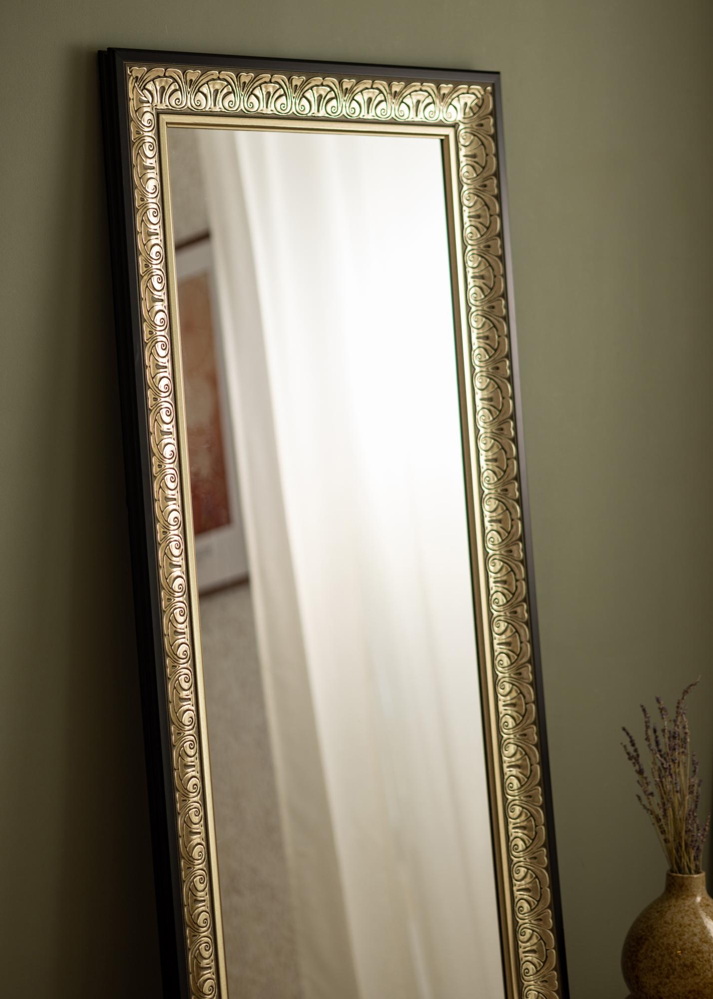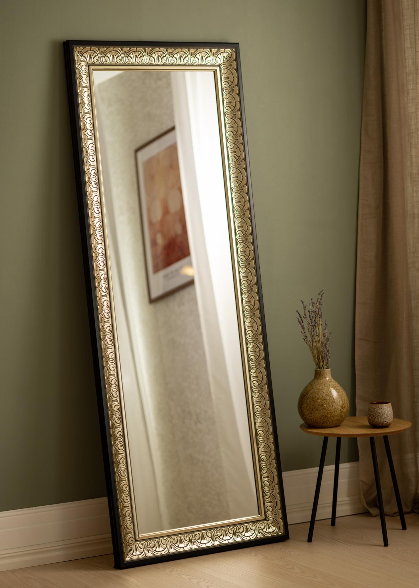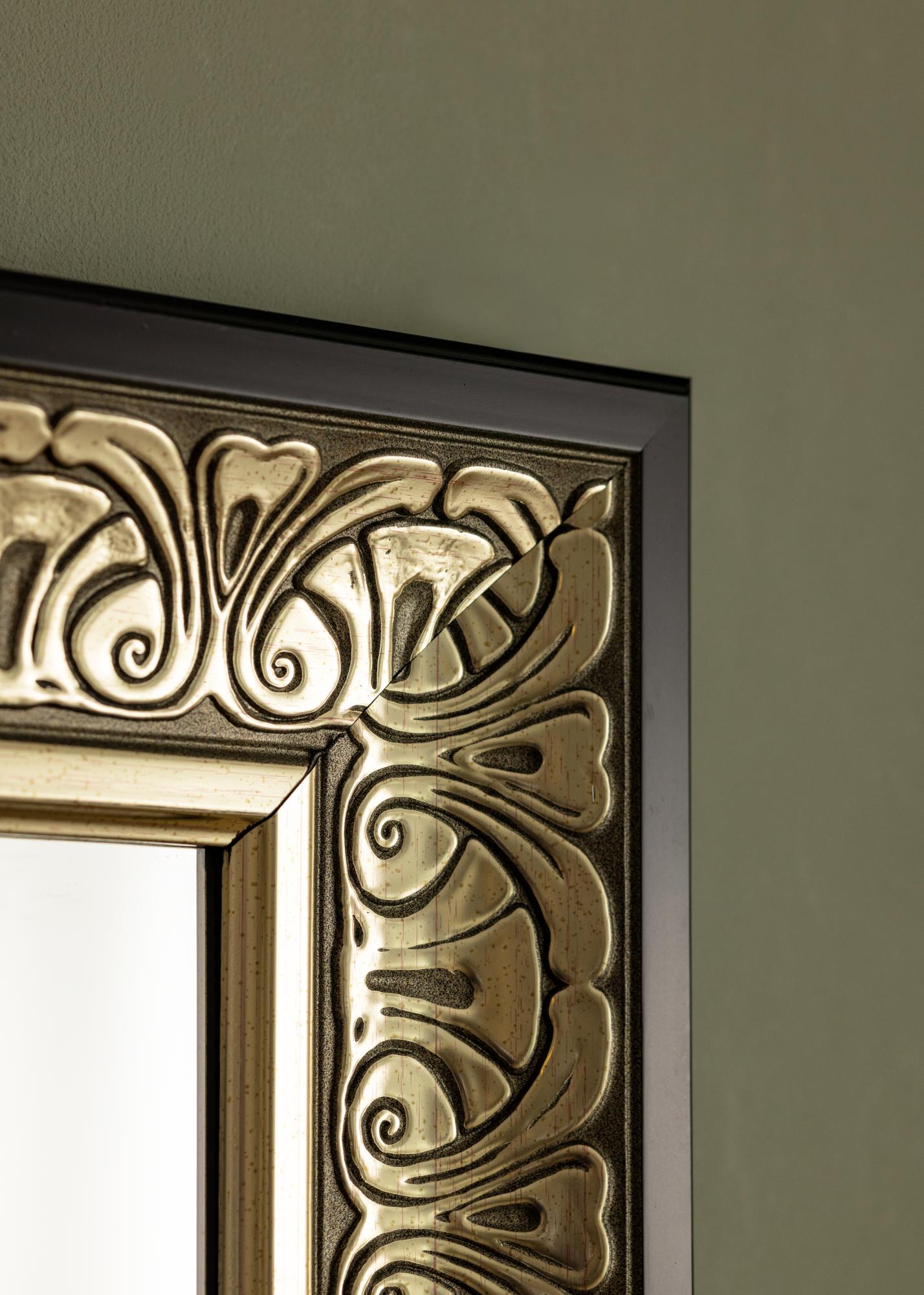 Schicker silberner Spiegel mit Ornamenten, der sowohl in einen begehbaren Kleiderschrank als auch in den Flur oder ins Badezimmer passt. Das Design des Rahmens um den Spiegel mit seinem zeitlosen Muster ermöglicht es, sich in alle Arten von Einrichtungsstilen einzufügen, von romantischen und feminin eingerichteten Schlafzimmern in Pastellfarben bis hin zu stilvollen aber schlicht gehaltenen Umgebungen, in denen der Spiegel einen Kontrast erzeugt. Er eignet sich sogar gut, um ihn über einem Sideboard oder Buffet aufzuhängen, um den Eindruck von mehr Platz im Raum zu vermitteln.