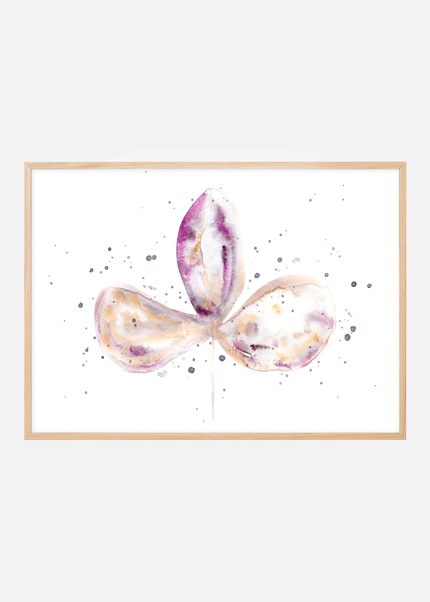 Ein helles Poster mit drei lila Blütenblättern in der Mitte eines weißen Hintergrunds. Verschiedene Lila-Töne bilden diese weichen, ausladenden Blätter. Violette Farbkleckse auf den Blättern sorgen für eine abstrakte Stimmung. Bringen Sie die Farben zur Geltung, indem Sie dieses Poster an eine fliederfarbene Wand hängen.