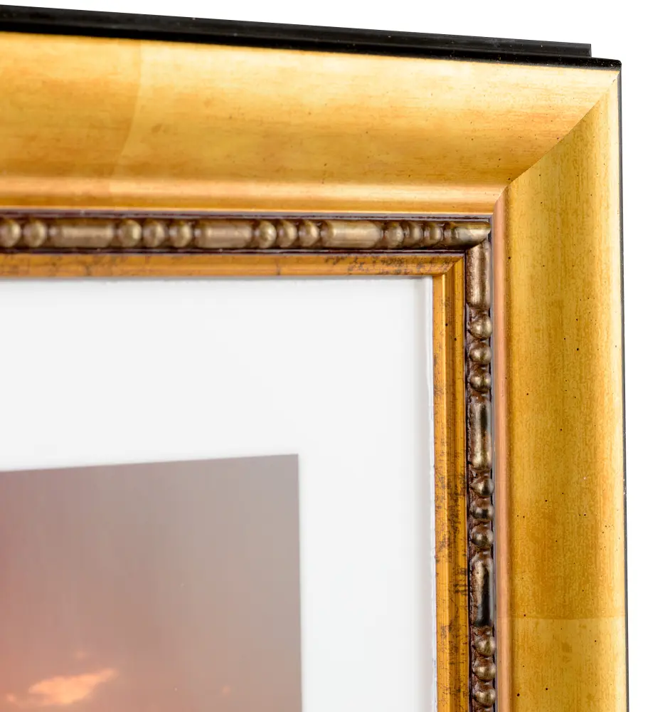 Klassischer Porträtrahmen für Fotos, die du besonders gerne magst. Der Bilderrahmen hat schwarze Seiten mit einer profilierten Goldfarbe auf der Vorderseite sowie Dekorationen an der Innenkante.