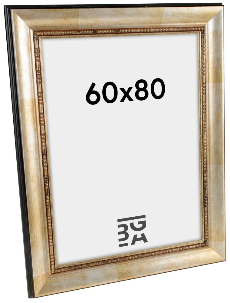 Klassischer Porträtrahmen für Fotos, die du besonders gerne magst. Der Bilderrahmen hat schwarze Seiten mit einer profilierten Silberfarbe auf der Vorderseite sowie Dekorationen an der Innenkante.