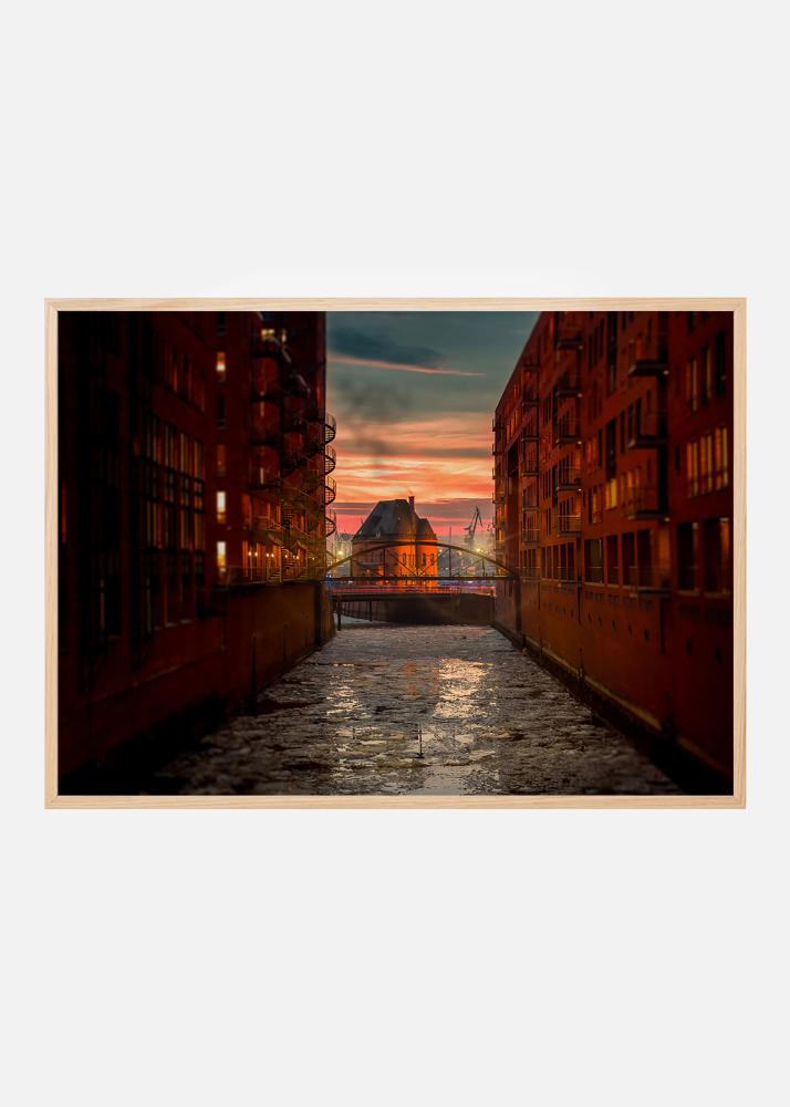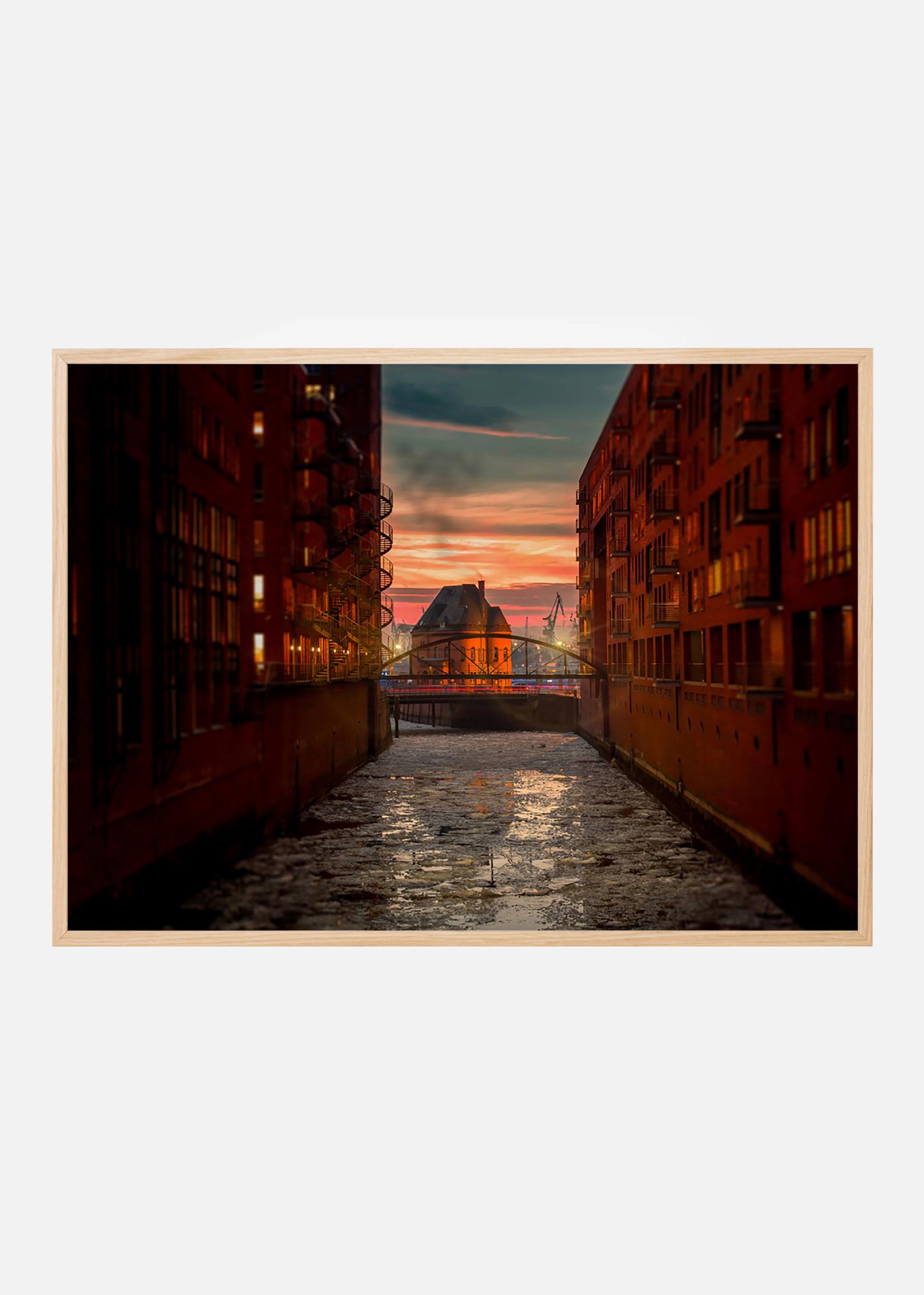 Sonnenuntergang über dem alten Lagerhausviertel Speicherstadt in Hamburg mit seinen Kanälen und neugotischen Backsteingebäuden. Das Fotografie aus dem denkmalgeschützten Bereich passt gut in das Zuhause eines Architektur- oder Geschichtsinteressierten. Das poster macht sich am besten in einem dünnen Metallrahmen, der zur strengen Architektur passt und sieht an der Wand zusammen mit anderen Stadtbildern schick aus.