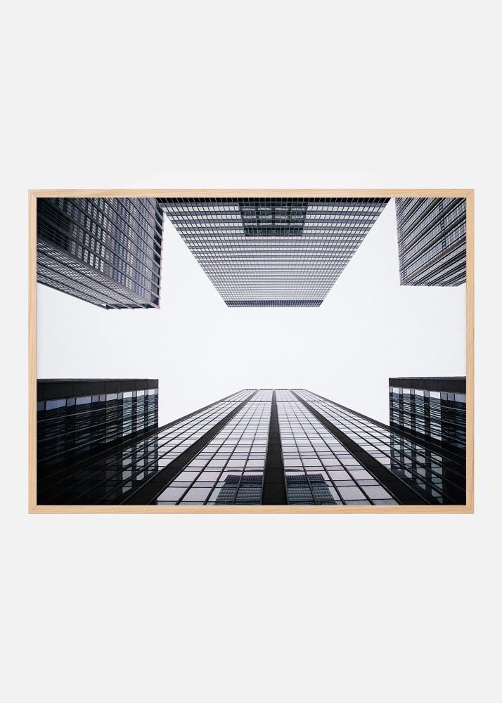Architekturposter mit wachsenden Wolkenkratzern gegen einen wolkenweißen Himmel. Stilvolles Bild von dunklen Gebäuden gegen einen weißen Hintergrund, mit den Reflexionen des Himmels in den Fensterscheiben. Perfektes Geschenk für jemanden, der grafische Gebäudeporträts mag. Das Print passt gut in einen schwarzen Rahmen, der das Dunkle im Bild verstärkt und sieht in Kombination mit anderen Fotografien von Architektur gut aus.