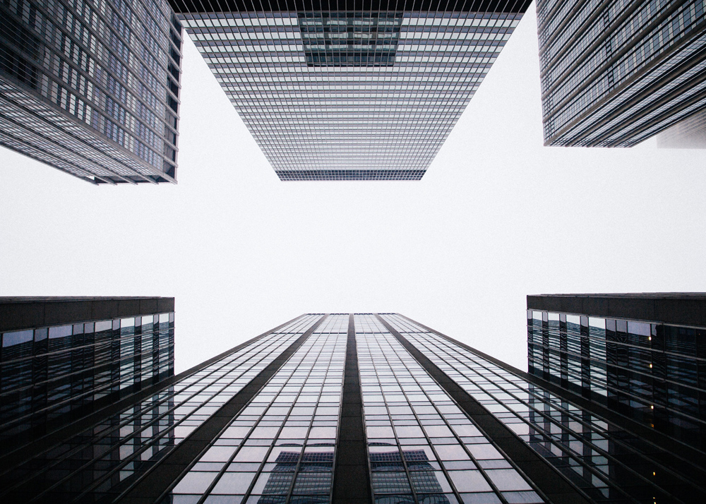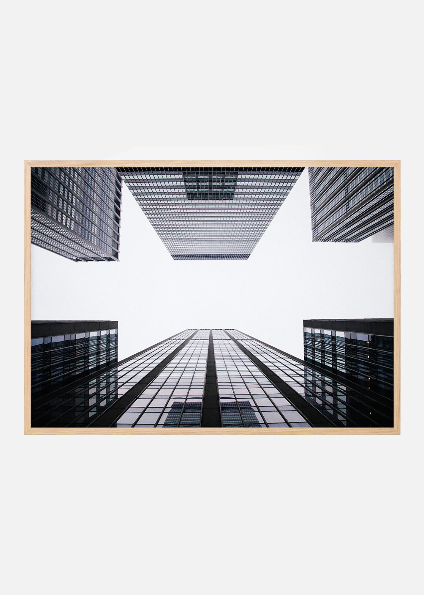 Architekturposter mit wachsenden Wolkenkratzern gegen einen wolkenweißen Himmel. Stilvolles Bild von dunklen Gebäuden gegen einen weißen Hintergrund, mit den Reflexionen des Himmels in den Fensterscheiben. Perfektes Geschenk für jemanden, der grafische Gebäudeporträts mag. Das Print passt gut in einen schwarzen Rahmen, der das Dunkle im Bild verstärkt und sieht in Kombination mit anderen Fotografien von Architektur schön aus.