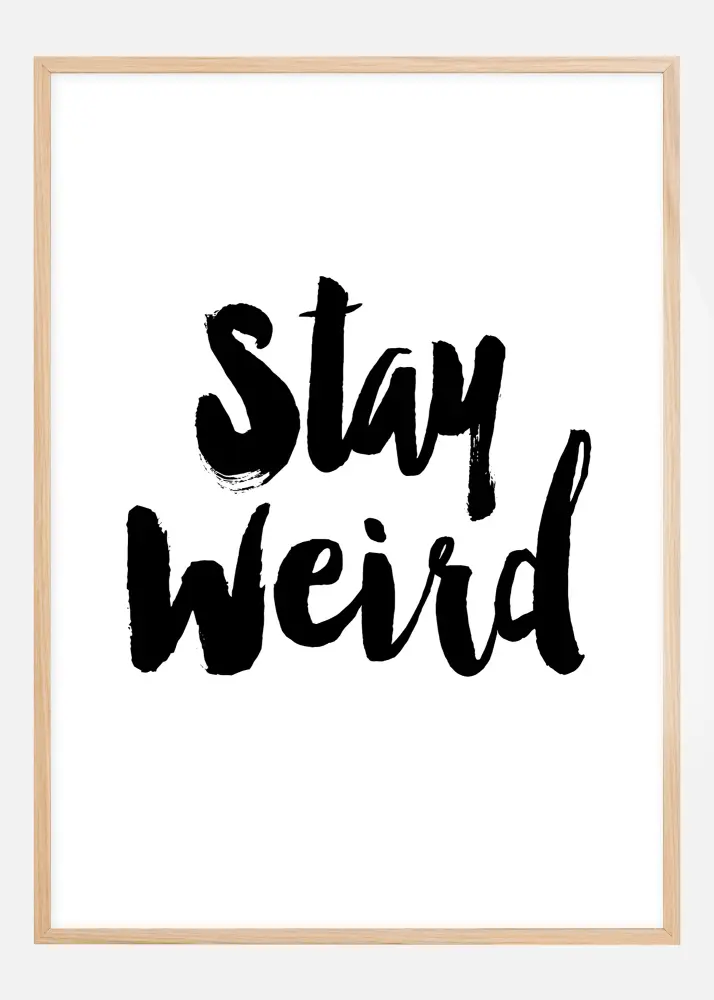 Viele von uns wachsen mit dem Glauben auf, dass es falsch ist, ungewöhnlich zu sein. Wir versuchen, unsere Persönlichkeitsmerkmale zu ändern, um hineinzupassen, anstatt einfach die Blockade zu lösen und die wunderbaren Individuen zu sein, die wir sind. Werfen Sie diese Blockade dahin, wo der Pfeffer wächst, und schaffen Sie sich stattdessen dieses herrliche poster an! Das plakat hat ein schickes und einfaches Design, bestehend aus dem Text „Stay Weird“ vor einem weißen Hintergrund. Der Text ist in einer Schriftart geschrieben, die an Pinselstriche denken lässt. Da es in verschiedenen Formaten verfügbar ist, funktioniert es ebenso gut auf dem Schreibtisch wie an der Wand. Platzieren Sie es, wie es ist, oder kombinieren Sie es mit einem eleganten Rahmen in 40x50 cm aus unserem großen Sortiment.