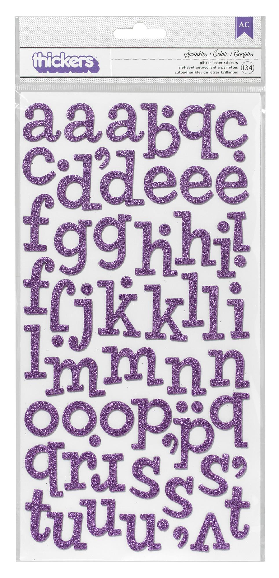 Lila Aufkleber für dein nächstes Scrapbooking-Projekt? Wir glauben, dass du sie brauchst! Die Aufkleber haben eine glitzernde Oberfläche und eine Höhe von 2,5 cm.