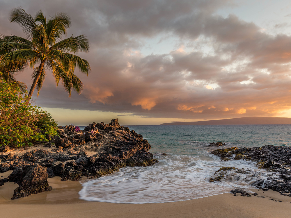 Ein Strand bei Sonnenuntergang, ein schöner Klischee, der ein Muss für den Tiki-Enthusiasten oder das tropische Thema ist. Poster mit der klassischen Palme, die sich über den Rand des Strandes in den letzten goldenen Sonnenstrahlen des Tages neigt. Das Fotografie sieht toll in einem Bilderrahmen mit verwittertem Aussehen oder in einer kräftigen Farbe aus, um zur Tiki-Einrichtung zu passen.