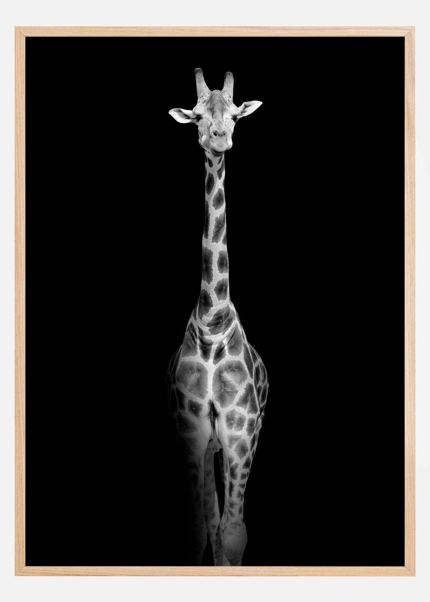 Fotografische Kunst in Schwarz-Weiß von einer schlanken Giraffe, die aus dem schwarzen Hintergrund des Bildes heraustritt. Ein stilvolles und kontrastreiches Poster mit einer wunderbaren Tiefe. Kombinieren Sie es gerne mit anderen unserer schönen Tierposter im gleichen Stil für eine Bildwand im gleichen Thema.