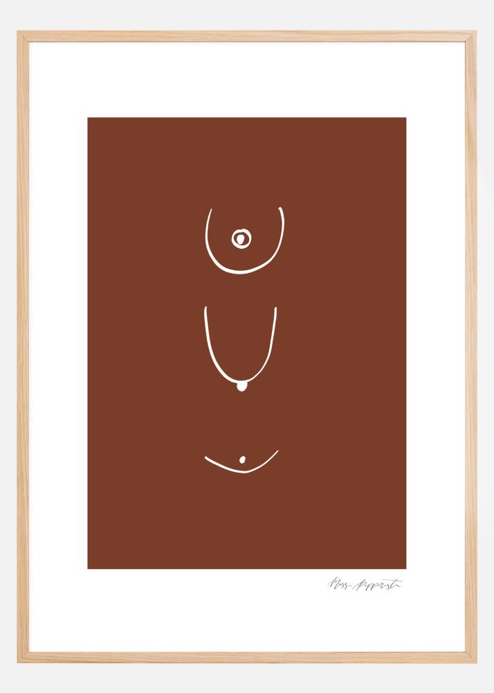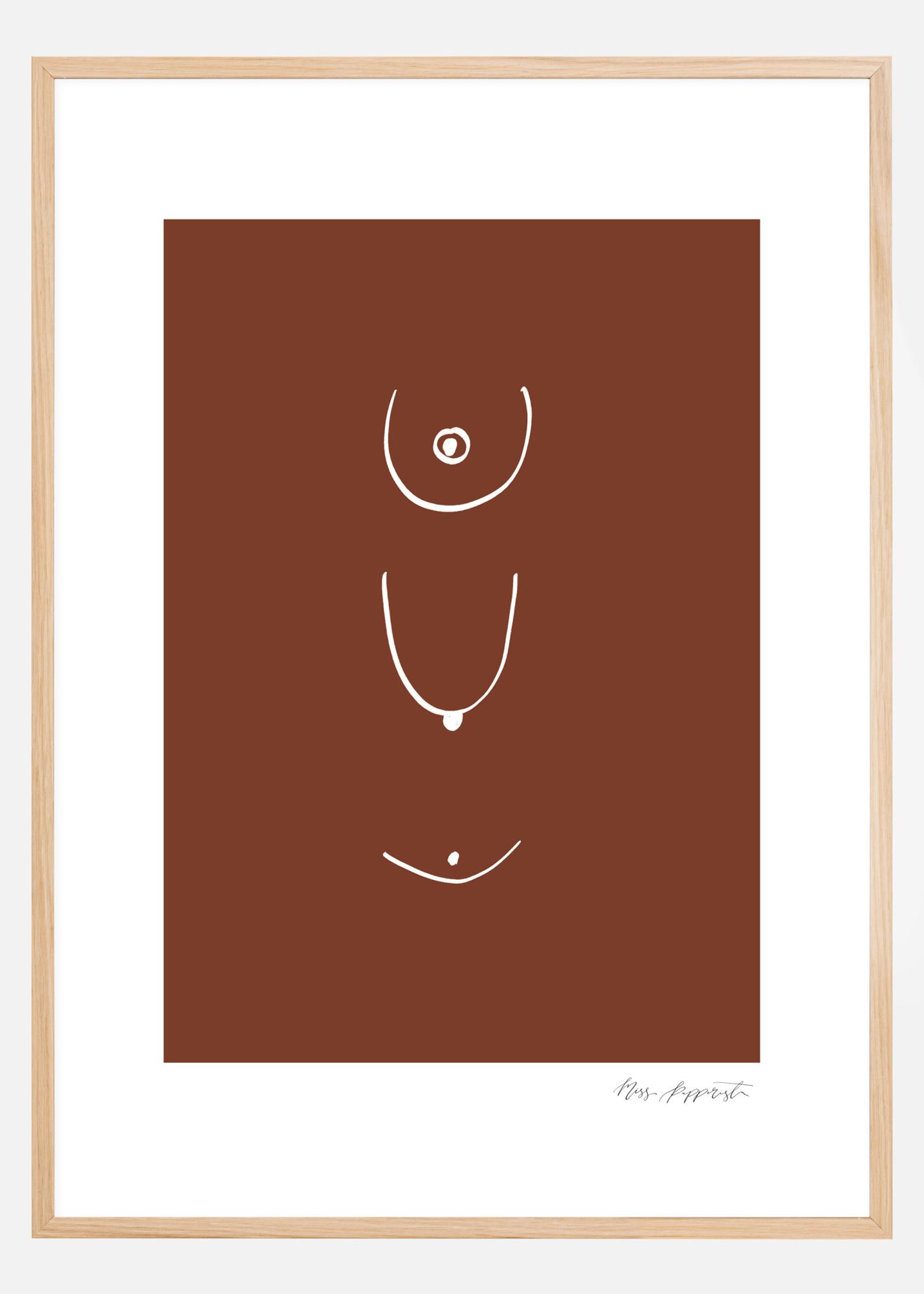 Ein abstraktes Poster mit weißen geschwungenen Linien und Punkten auf einem schlichten braunen Hintergrund. Die Linien können nach Belieben interpretiert werden, aber sie sehen aus wie Frauenbrüste, die aus verschiedenen Blickwinkeln gezeichnet wurden. Genießen Sie die leicht seltsame Natur dieses einfachen Bildes.