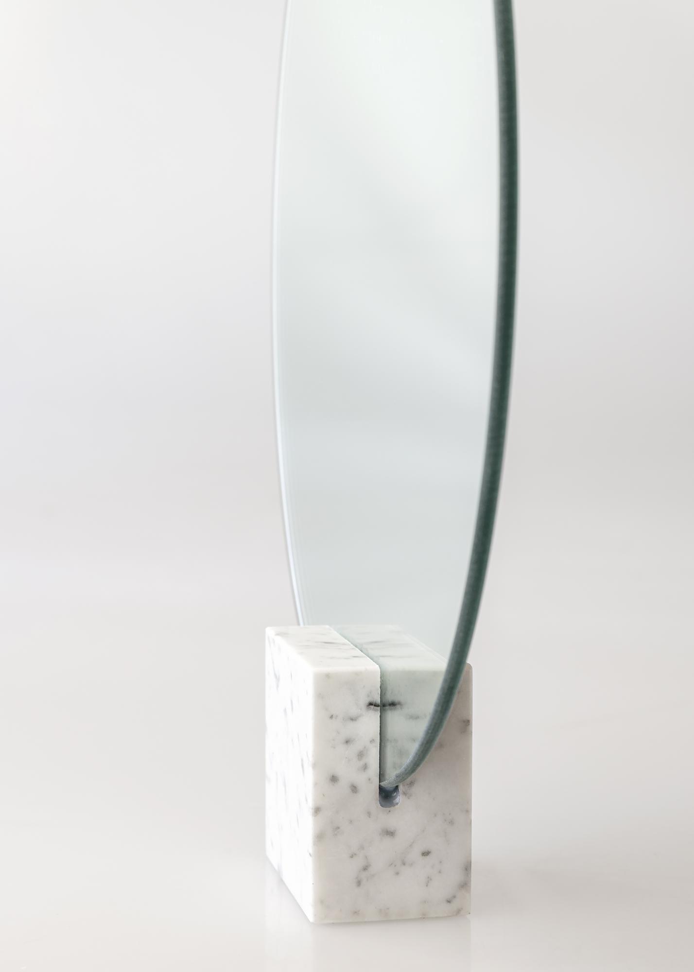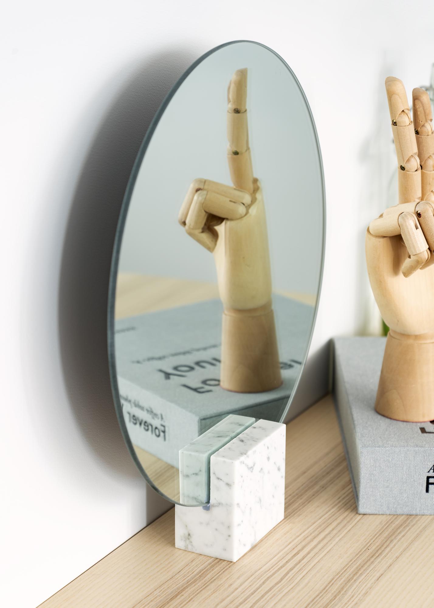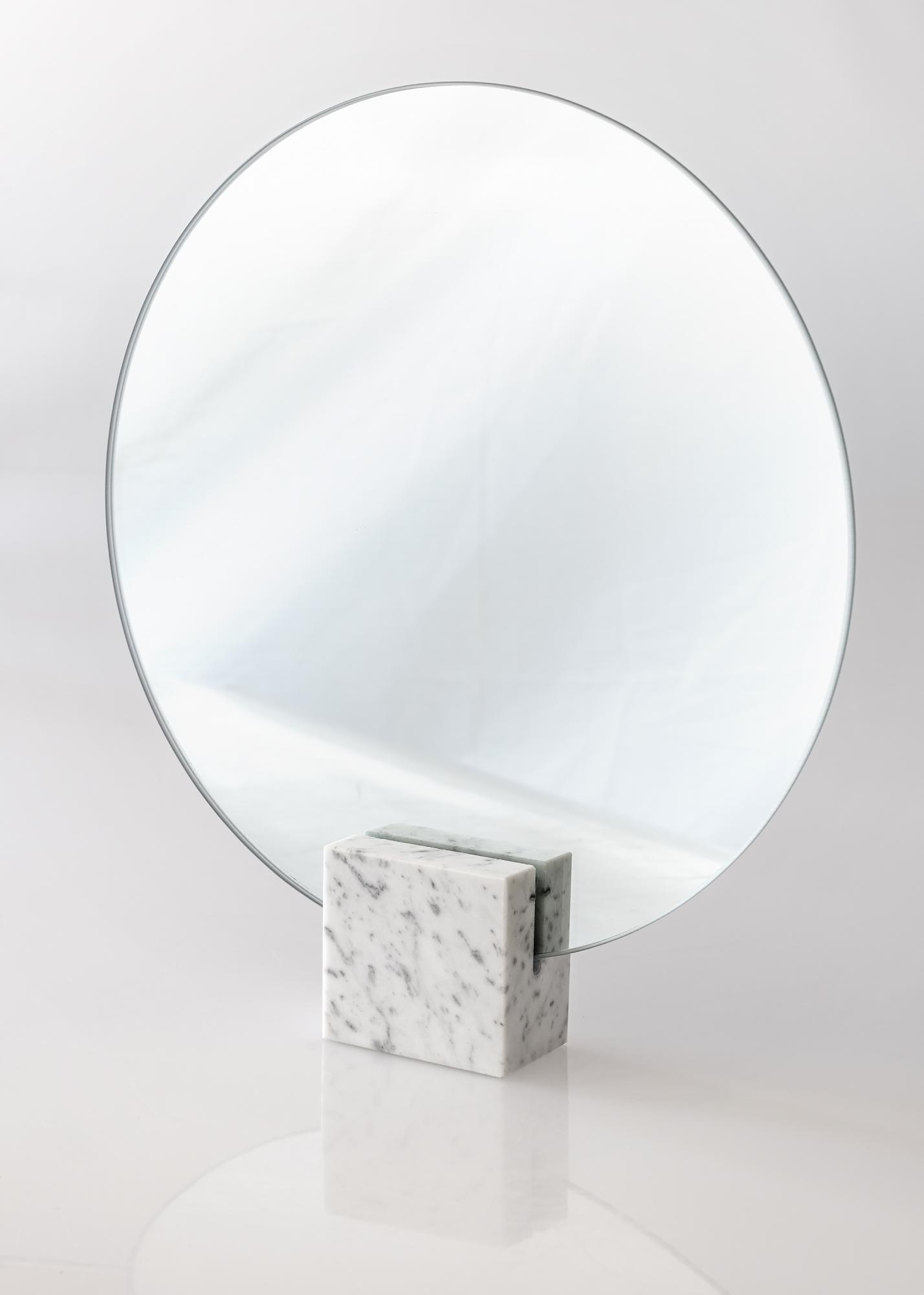 Dieser runde Tischspiegel zeichnet sich durch sein stilvollendetes Design aus. Das weiche, runde Spiegelglas ergibt im Zusammenspiel mit dem eckigen Standfuß aus Marmor einen spannenden, ansprechenden Kontrast.
