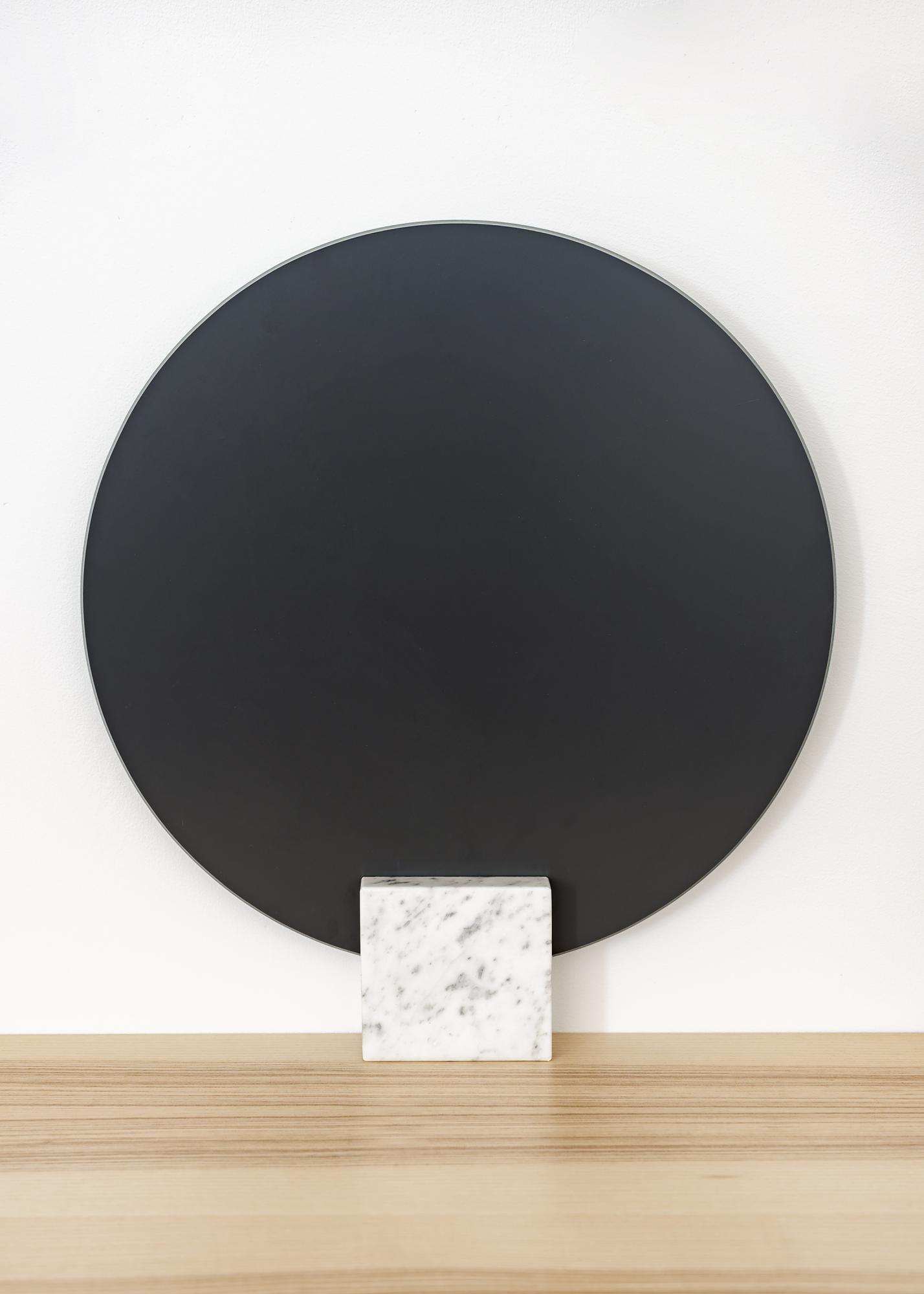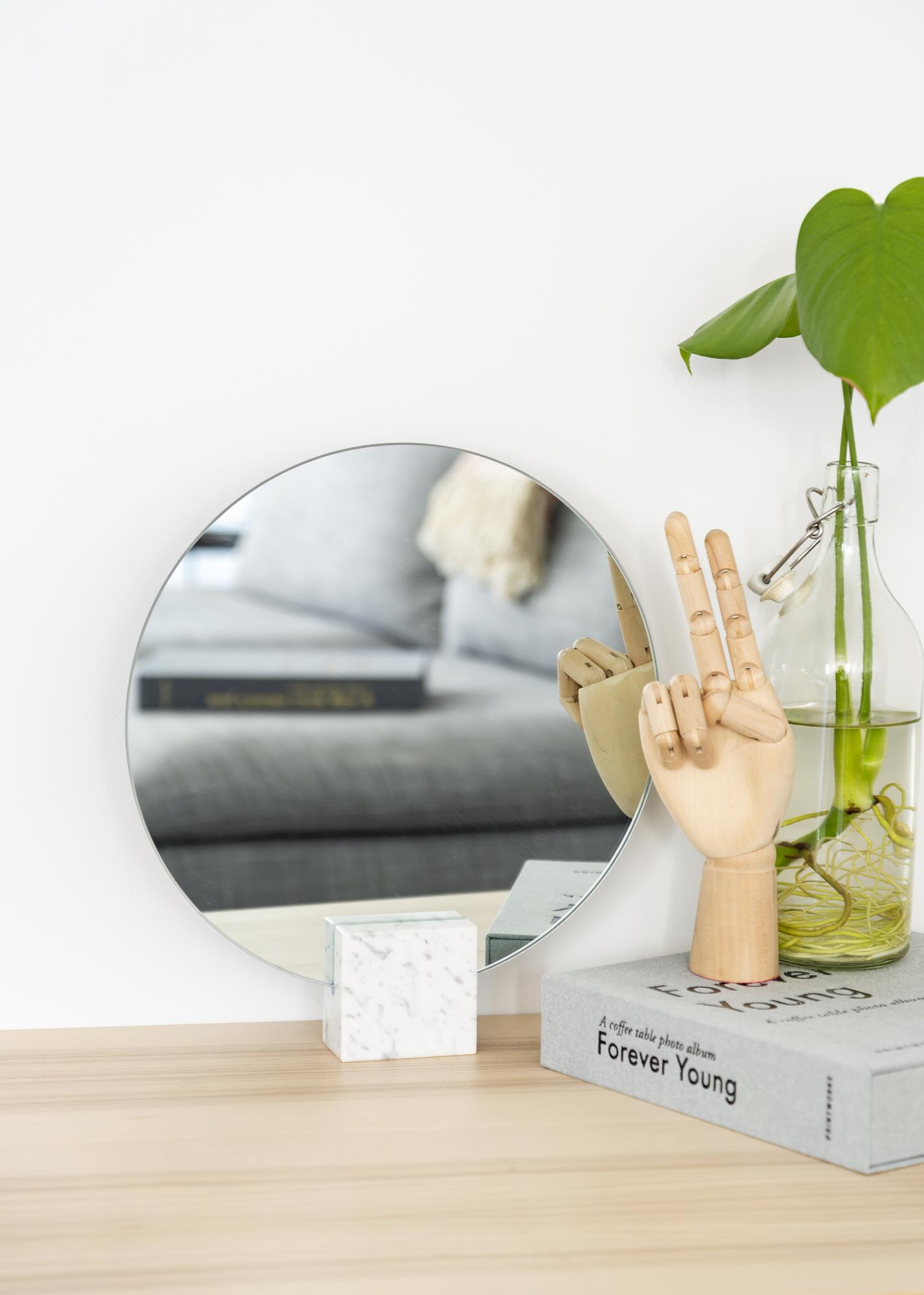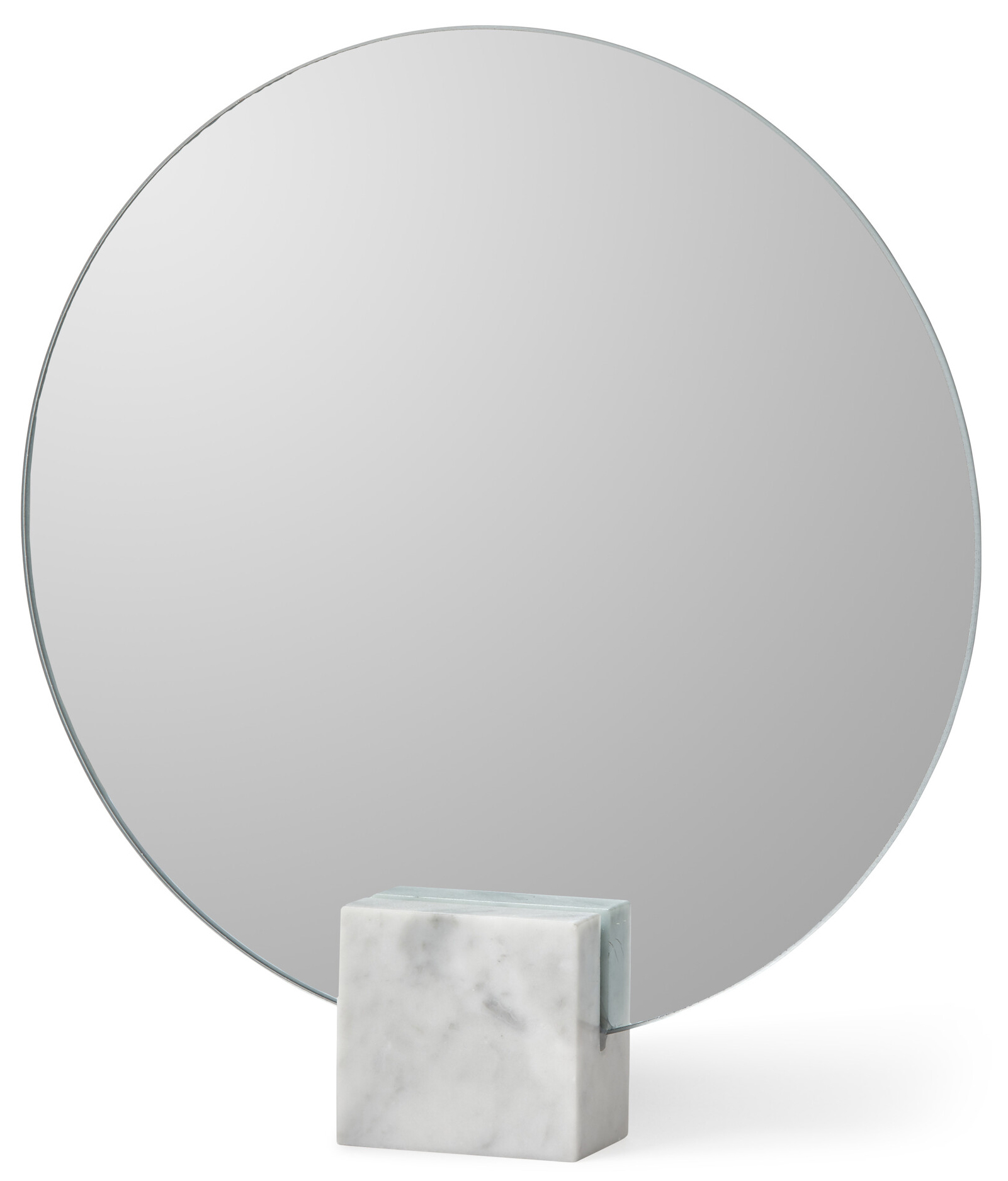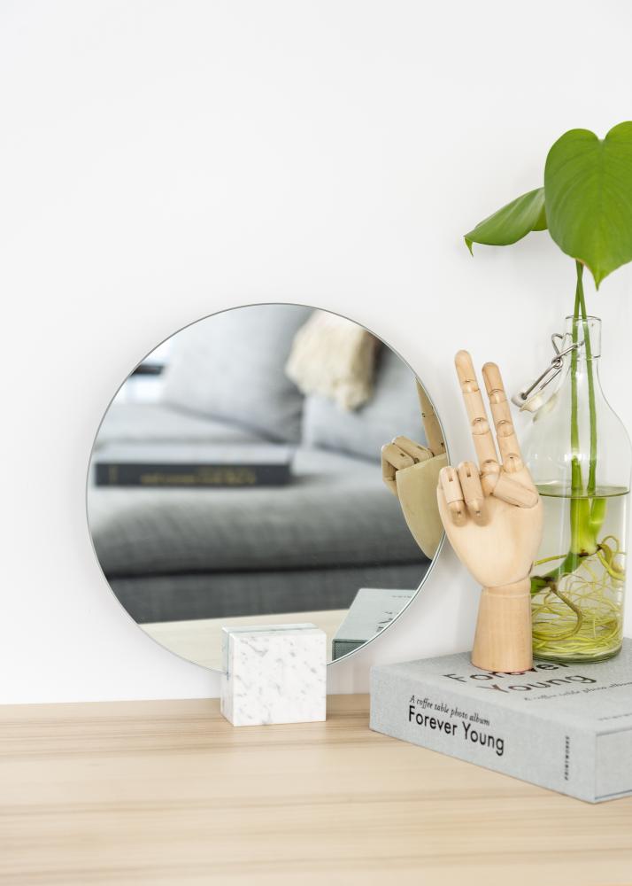 Dieser runde Tischspiegel zeichnet sich durch sein stilvollendetes Design aus. Das weiche, runde Spiegelglas ergibt im Zusammenspiel mit dem eckigen Standfuß aus Marmor einen spannenden, ansprechenden Kontrast.