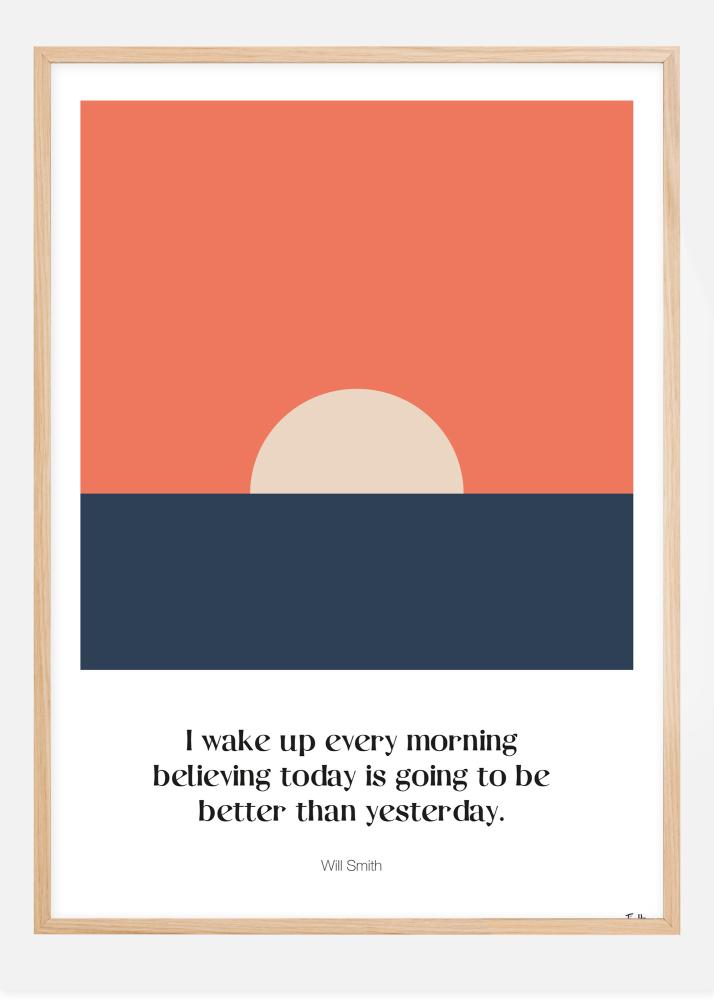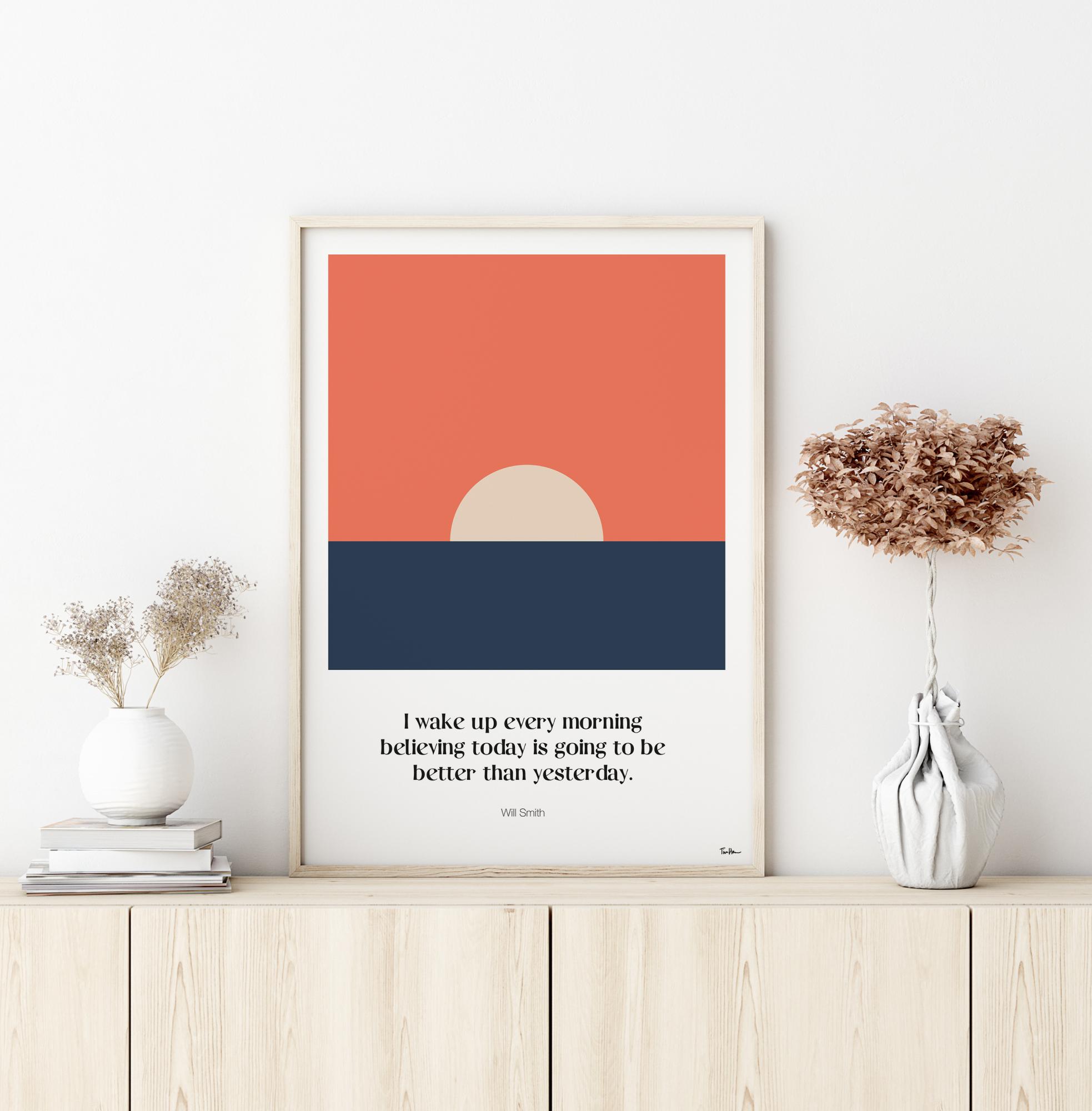 Ein poster mit einem Zitat von Will Smith "I wake up every morning believing today is going to be better than yesterday" geschrieben unter einer grafischen Illustration eines Sonnenaufgangs. Ein elegantes und stilvolles poster kreiert von Tim Hansson.