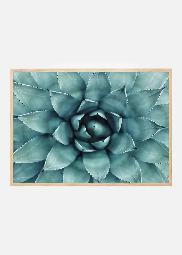 Grafisches Poster mit einer schönen Nahaufnahme einer grünblauen Kaktus. Die klare Form der Blätter mit den dunklen Stacheln und die gedämpfte türkise Farbe schaffen ein ansprechendes Muster, das sich gut in alle Arten von Einrichtungen einfügt. Mit einem dunklen Bilderrahmen als Rahmen macht sich die Fotografie gut an der Wand alleine, kann aber auch als Teil eines Bildcollage mit Pflanzen verwendet werden.