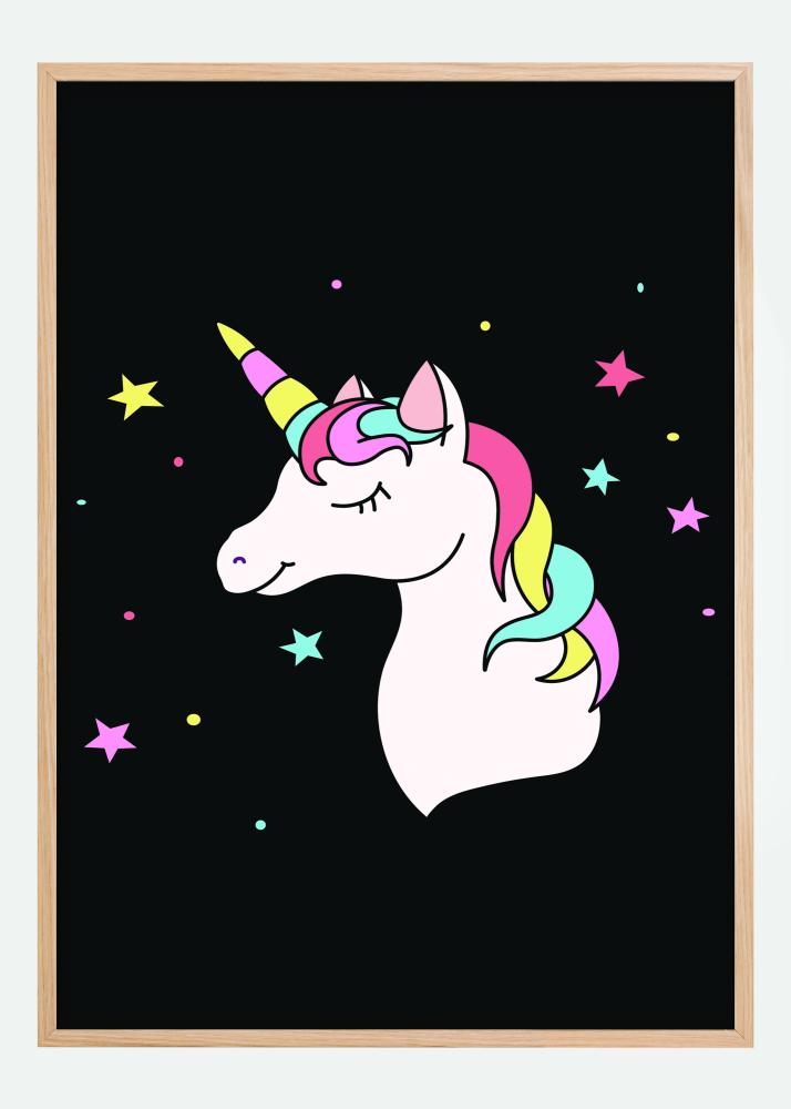 Ein süßes Poster mit einem kindlichen weißen Einhorn auf schwarzem Hintergrund. Das Einhorn hat eine rosa, gelbe und türkise Mähne und ein Horn. Sterne in denselben Farben füllen den schwarzen Hintergrund und sorgen für eine lustige Prinzessinnen-Atmosphäre. Mit diesem Poster können Sie das Kinderzimmer Ihres Kindes mit einem lustigen Bild schmücken, das seine Fantasie anregt.