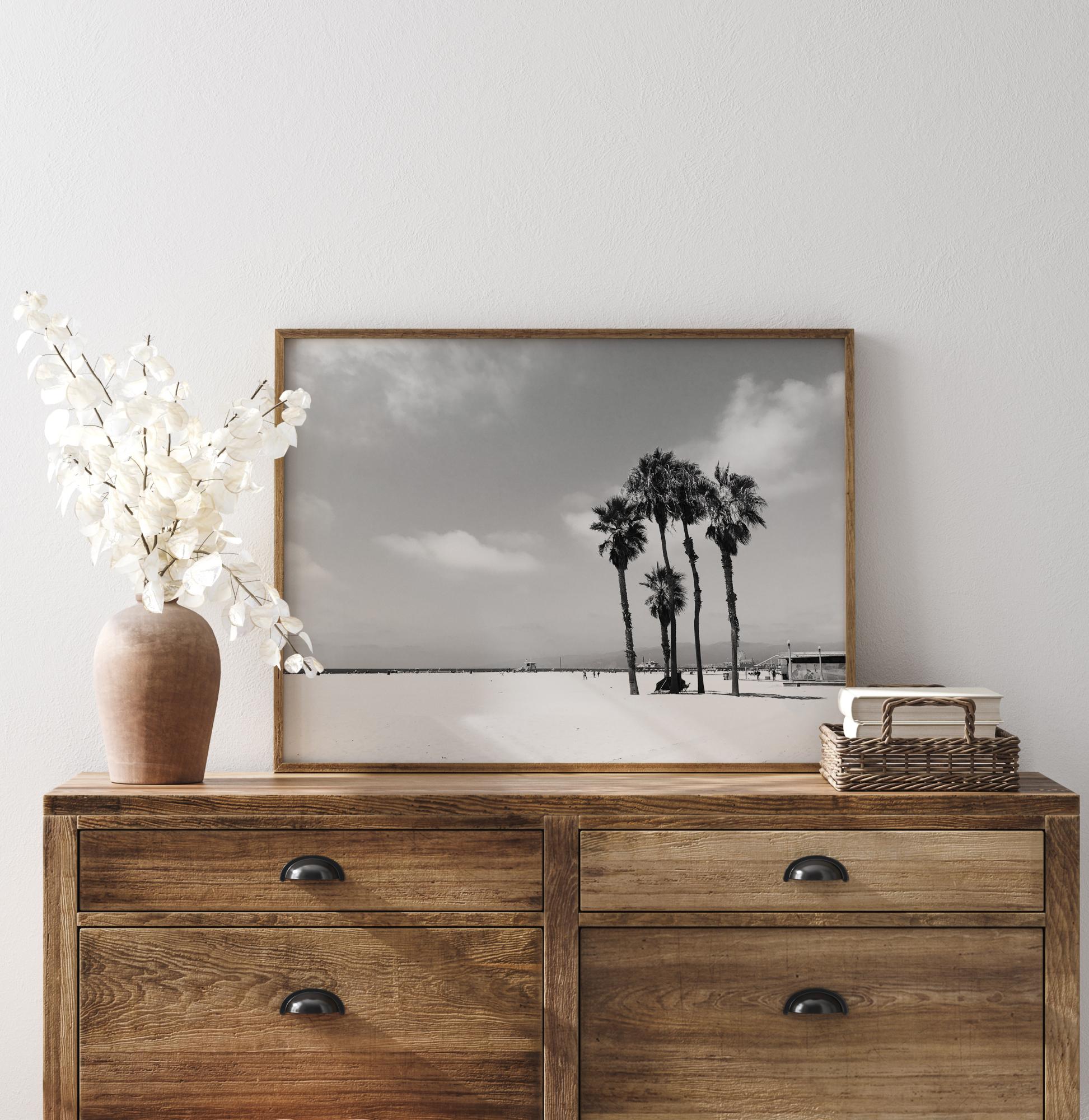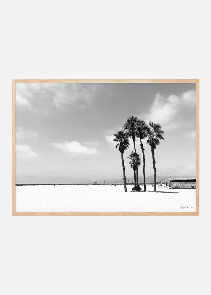 Hier führt uns die Fotografin Saphira Consilio zum weißen Strand von Venedig. Hier teilen sich die Menschen den Platz mit wunderschönen Palmen, Vergnügungsparks und den Rettungstürmen der Bademeister. Ein schönes schwarz-weißes poster im Querformat.