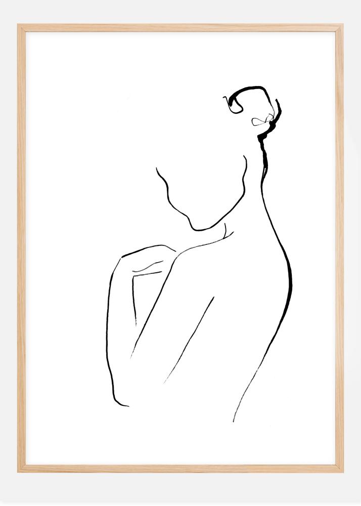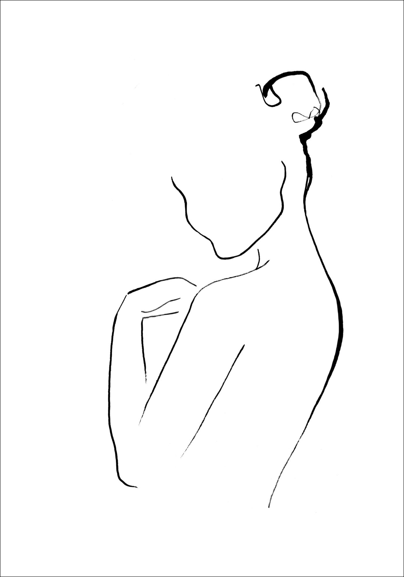 Wunderschöne, zarte Linienkunst einer Frau, gezeichnet mit Tinte, erstellt von der Künstlerin Cora Eklund, Cora Konst & Illustration. Ein einfaches und stilvolles poster, das zu den meisten Heimen und Einrichtungsstilen passt und leicht mit anderen Favoriten auf einer größeren Bildwand kombiniert werden kann.