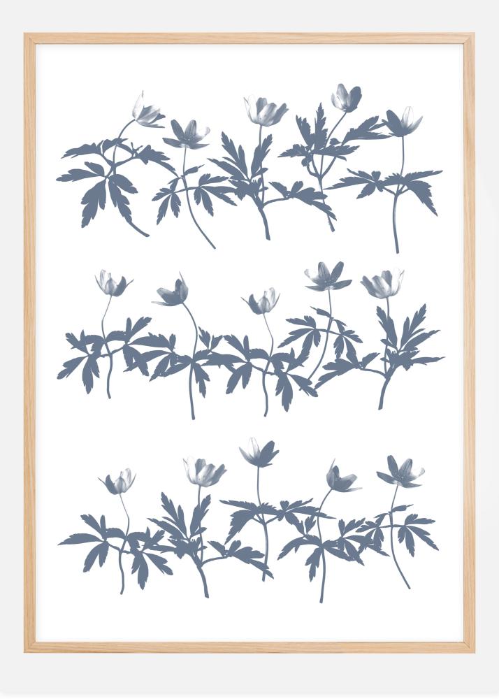 Ein einfaches Poster mit blauen Buschwindröschen in einem Druckmuster. Das Muster wiederholt sich und ist eine hübsche Ergänzung für eine einfache Wand. Dieses Poster würde gut in einem Badezimmer passen, um den Wasseraspekt des Raumes widerzuspiegeln, ohne als Druck zu aufdringlich zu sein.