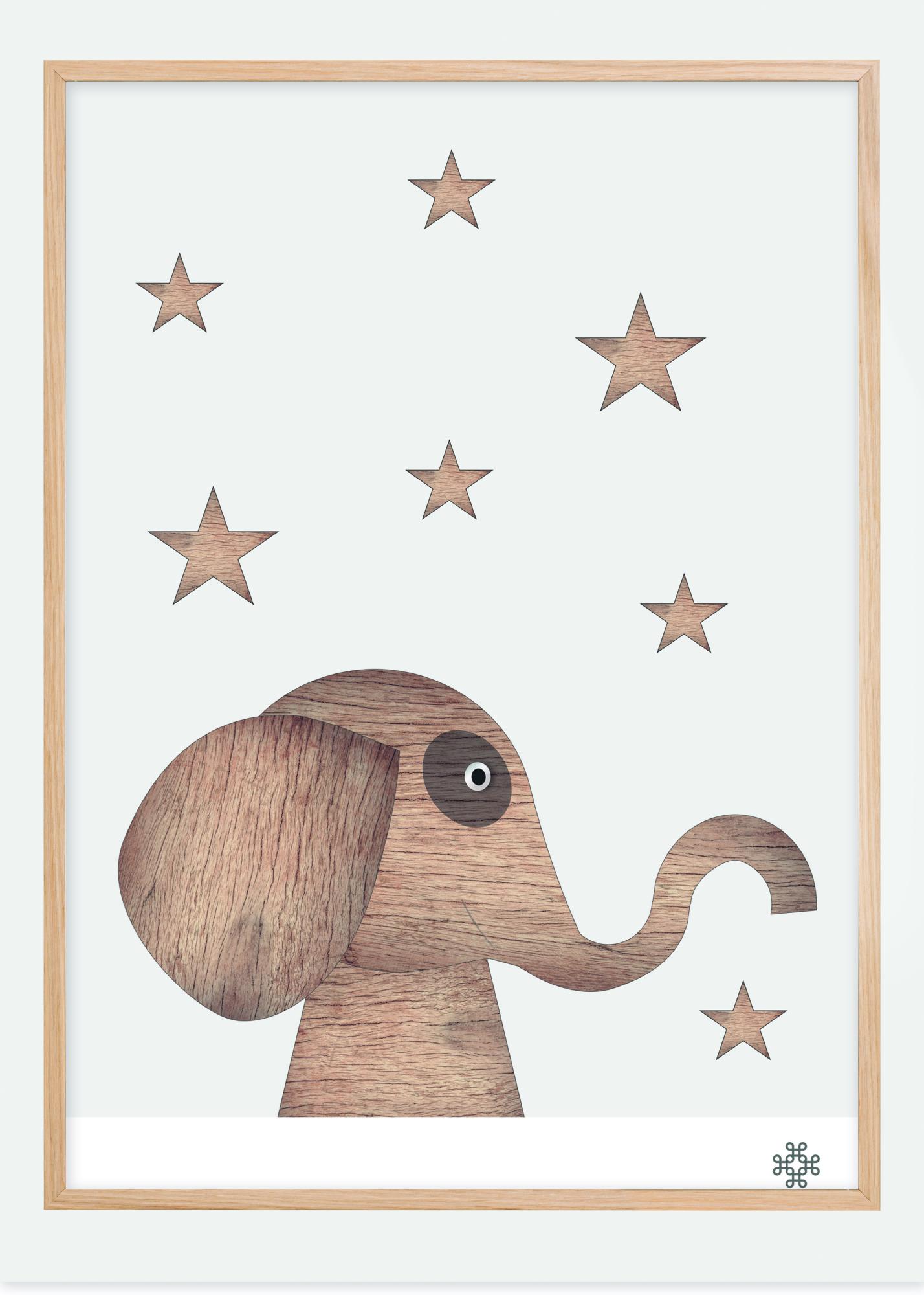 Ein Holzdesign-Poster mit einem niedlichen Elefanten, der von Sternen umgeben ist. Der Elefant besteht aus Bildern von Holzmaserungen, die ihm einen strukturierten Effekt verleihen. Die Sterne sind rundherum platziert, um dieses schrullige Bild zu kreieren, das eine positive, glückliche Ergänzung für jedes Kinderzimmer sein würde.