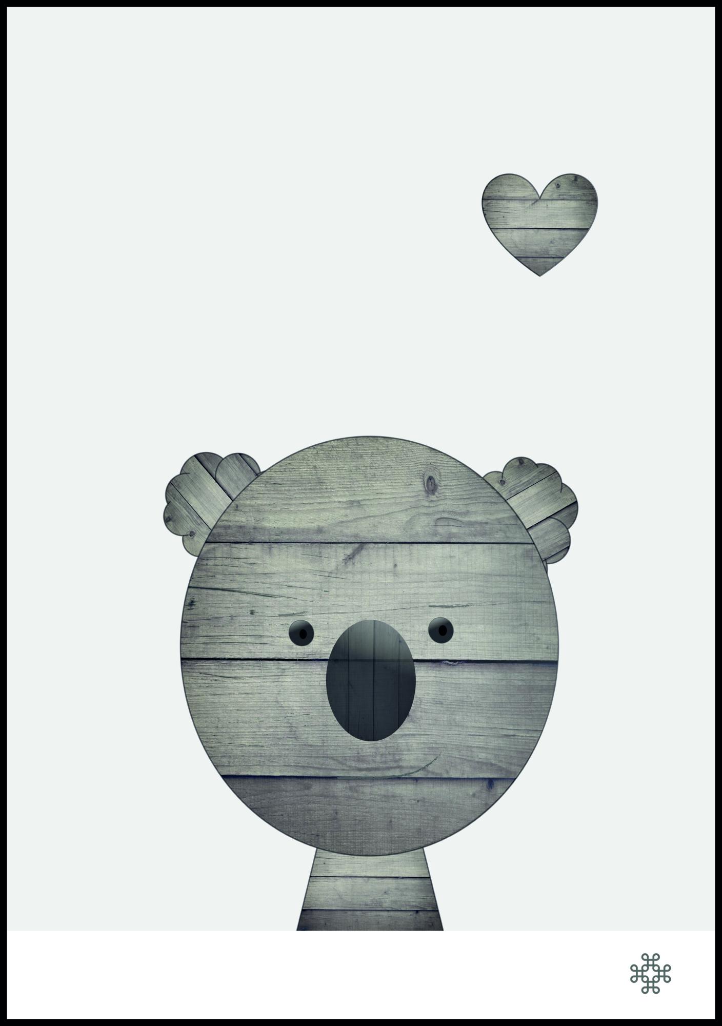 Ein Schwarz-Weiß-Poster eines Koalabären aus Holzmaserungsbildern. Über dem grauen Koala befindet sich ein winziges Herzchen mit der gleichen Holzmaserung. Dieser niedliche kleine Bär schenkt Ihnen all die Liebe und ist eine großartige Ergänzung für jedes Zimmer, um dieses liebevolle Gefühl zu vermitteln.