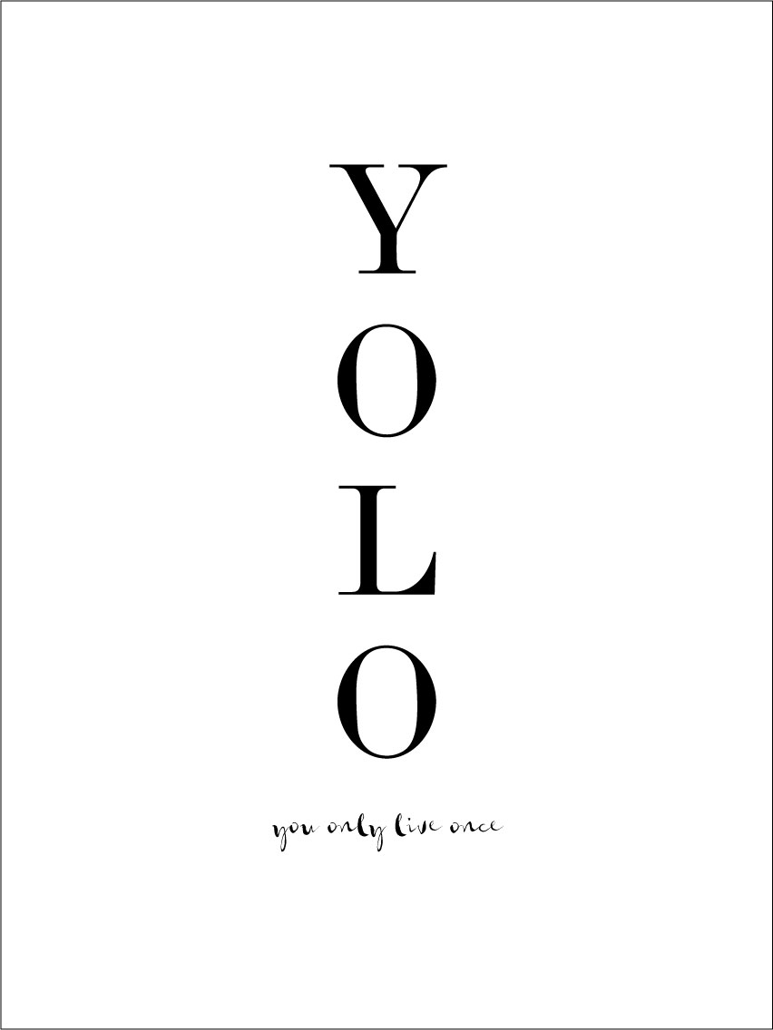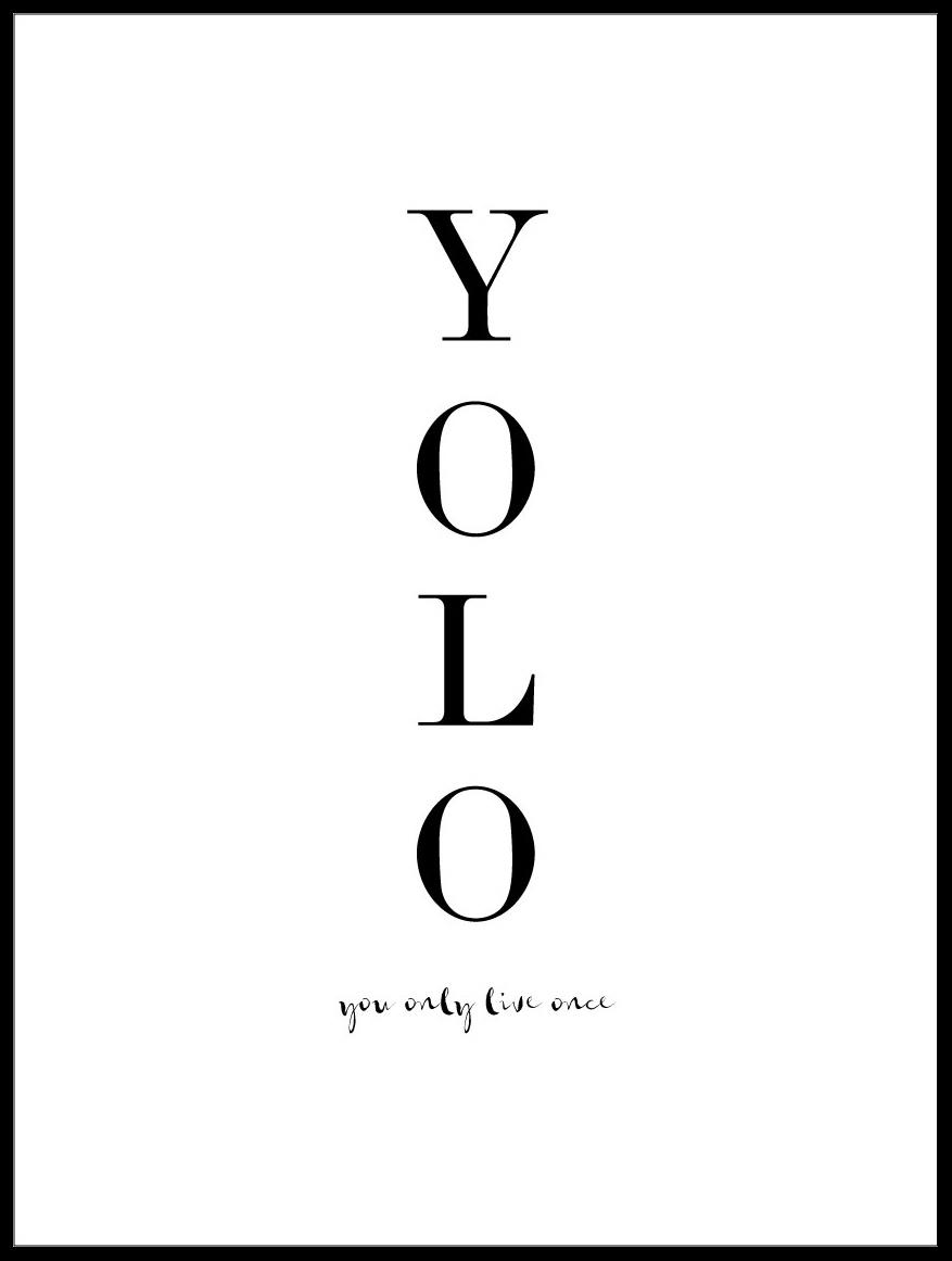 Ein grafisches Plakat mit der modernen Variante des Carpe diem "You Only Live Once". Die Botschaft, welche für sich selbst spricht, ist in schwarzer Schrift auf einen weißen Hintergrund gedruckt. Das Plakat passt zu einer stilganzen Person, die ihr Zuhause mit einem inspirierenden Spruch aufpeppen möchte. Ergänzen Sie das Bild mit Einrichtungsaccessoires, welche den Willen, das Leben leben zu wollen, verstärken.
