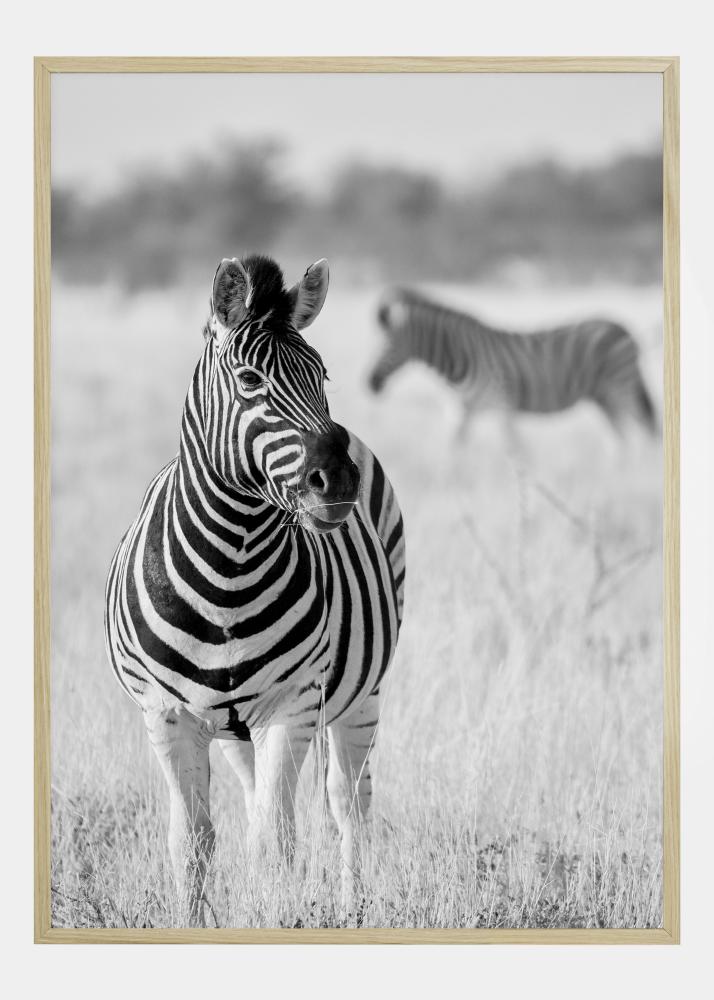Ein Wildtierposter mit einem Zebra in der afrikanischen Steppe. Ein kühnes Zebra steht aufmerksam im Vordergrund, während ein anderes in der Ferne vorbeizieht. Reisen Sie jeden Tag nach Afrika, wenn Sie dieses heitere Bild betrachten.