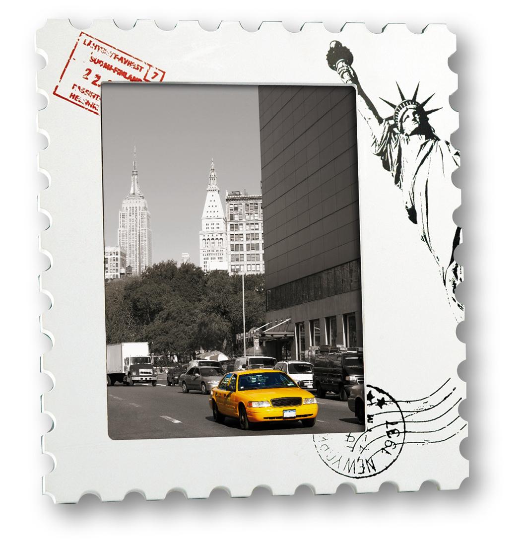 Weißer Fotorahmen, dessen Form an eine Briefmarke mit eckigen Linien und Poststempeln erinnert. Außerdem wurde der Rahmen von New York und der Freiheitsstatue inspiriert.