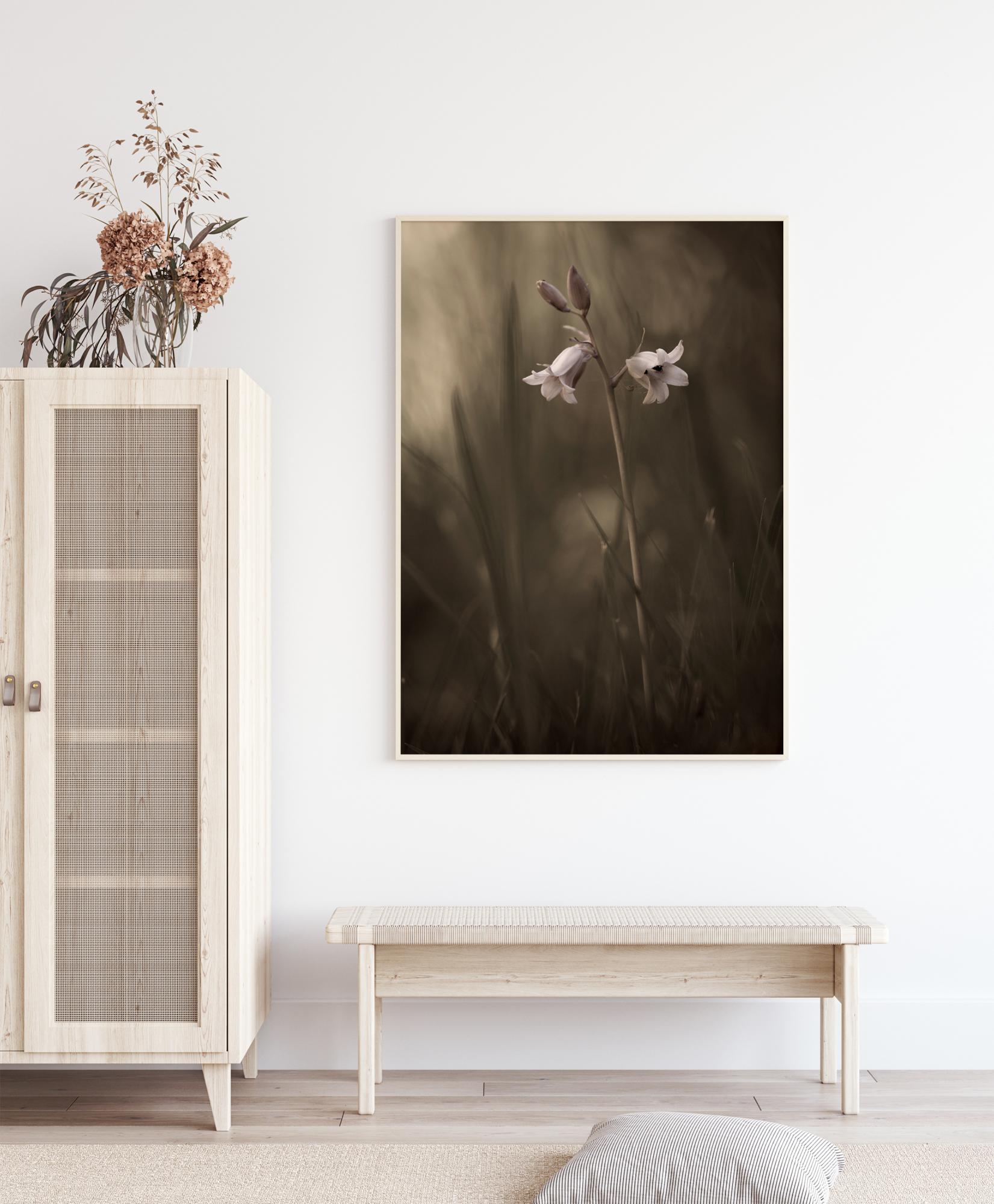 Ein zartes Poster mit einer weißen Blume vor einem unscharfen Hintergrund. Die weißen und rosafarbenen glockenförmigen Blumen heben sich von dem weichen Grasfeld im Hintergrund ab. Kombinieren Sie dieses schlichte, in Grüntönen gehaltene Bild mit einer hellen Wand, damit die Blumen auf diesem unauffälligen Poster besonders gut zur Geltung kommen.