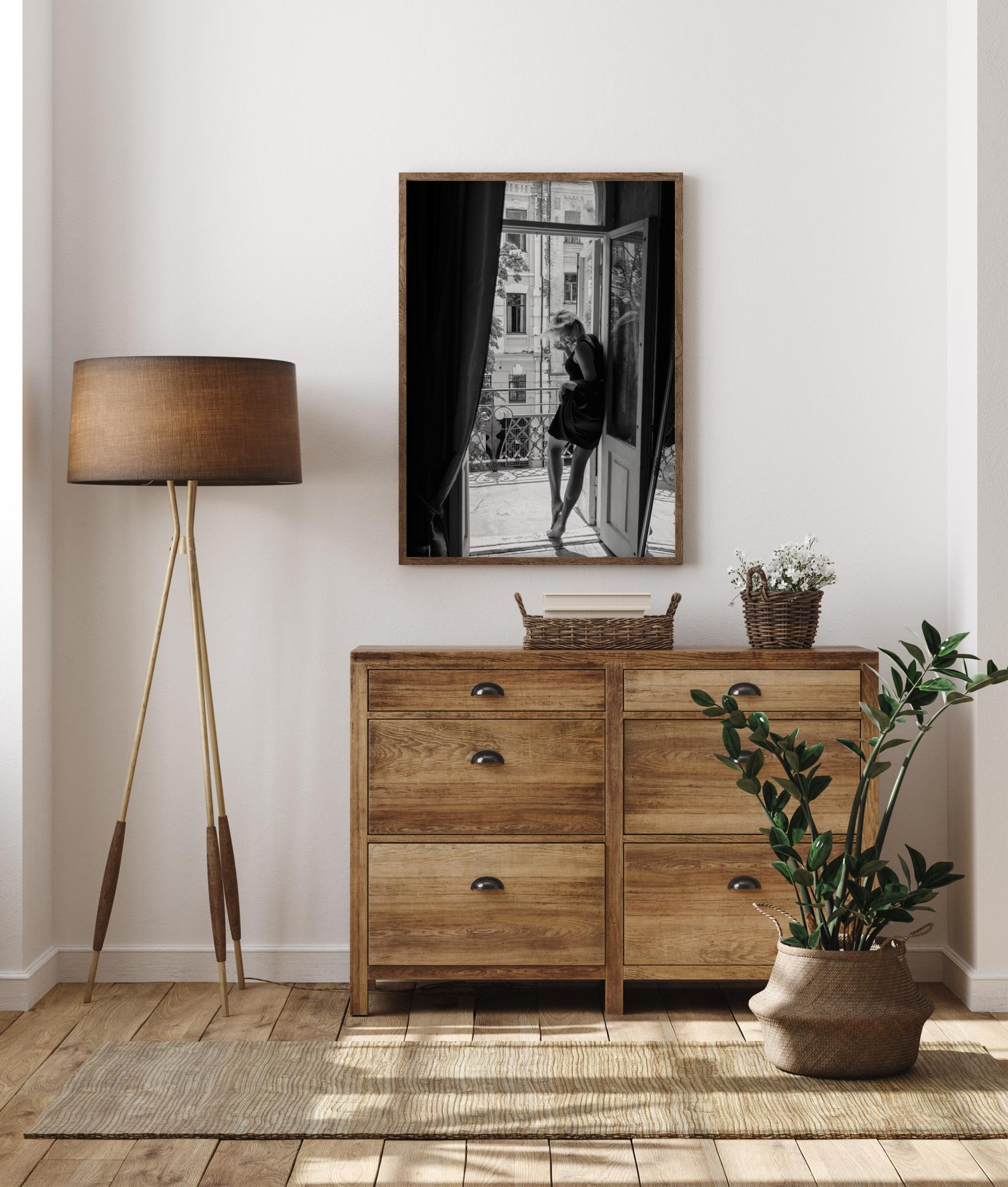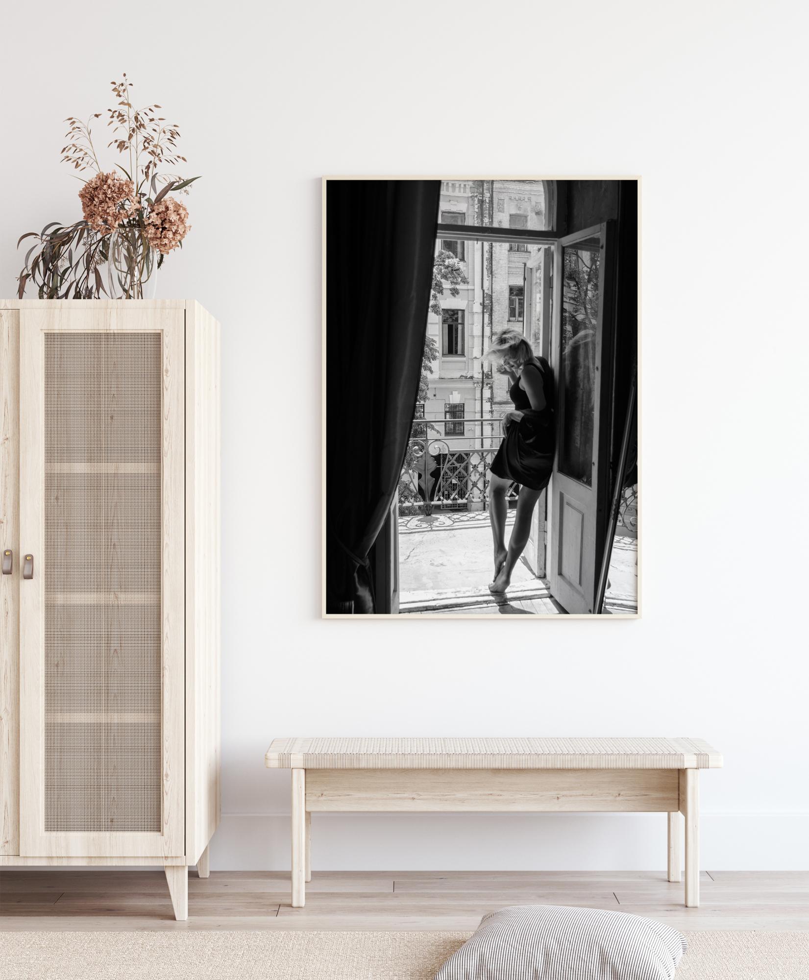 Ein klassisches Poster mit einer Frau auf einem Balkon in Paris. Die Frau trägt ein schwarzes Kleid, das ihre nackten Beine streckt, und lehnt sich an eine Tür, während sie auf Zehenspitzen steht und auf ihre Füße schaut. Kombinieren Sie dieses Schwarz-Weiß-Poster mit einer bunten Wand, um einen Hauch von Eleganz zu erzeugen.