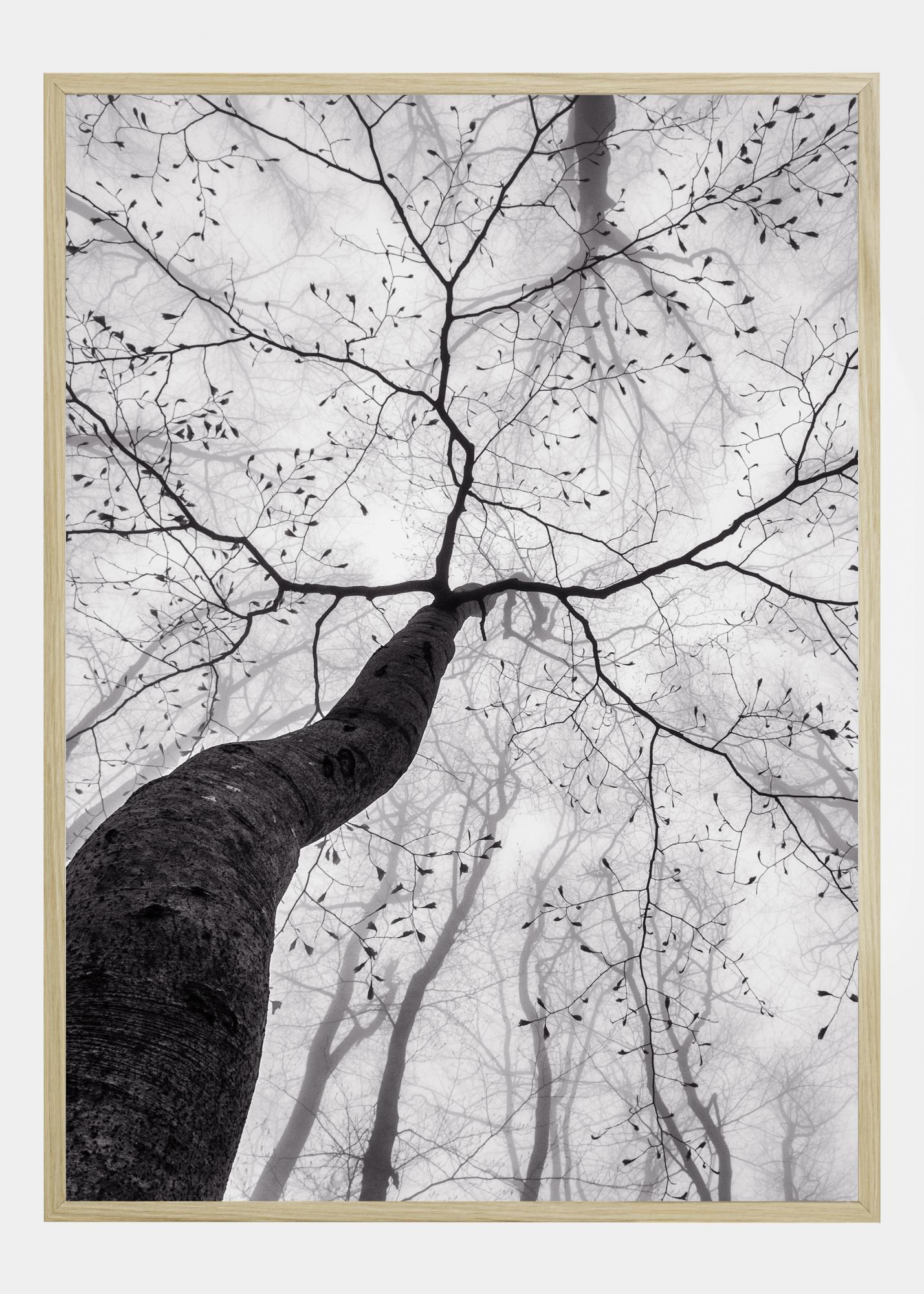 Ein Naturposter mit einem Baumstamm, der in den Himmel ragt. Schauen Sie am Stamm entlang nach oben zu den Ästen, die sich vor dem Himmel auffächern. Leicht verschwommene Bäume füllen den Hintergrund mit ihren Blättern. Hängen Sie diese Schwarz-Weiß-Aufnahme an Ihre Wand und spüren Sie die Ruhe der Natur.